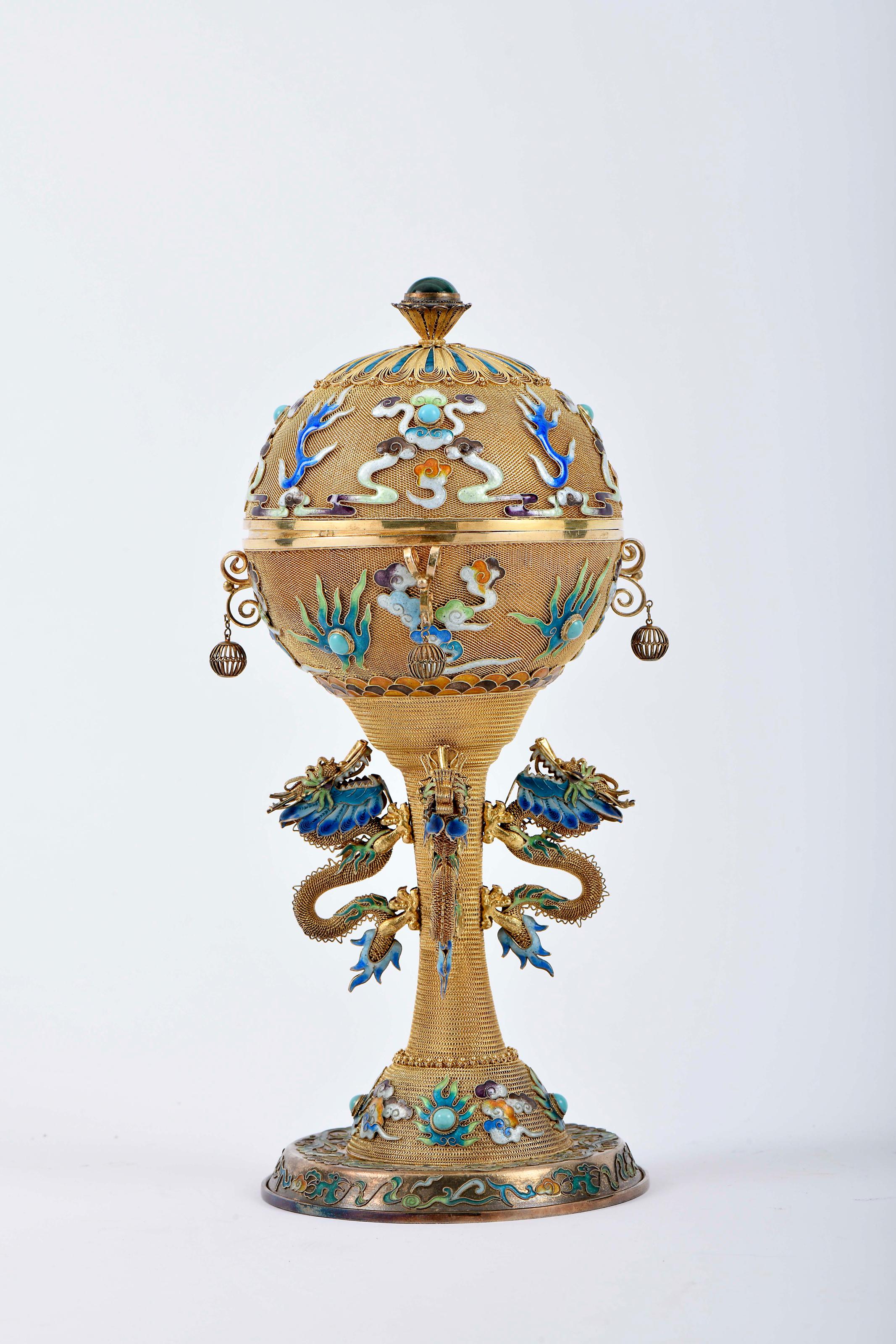 Taça de pé alto com tampa prata dourada de 925/1000 decoração esmaltada, aplicação de malaquite e turquesas em talhe cabochon, caixa original em madeira revestida a tecido Chinesa séc. XX (2ª metade) pequenos defeitos marcada posteriormente com contraste português pós-2021 Dimensões (altura x comprimento x largura) - 26 cm; Peso - 708 g.
