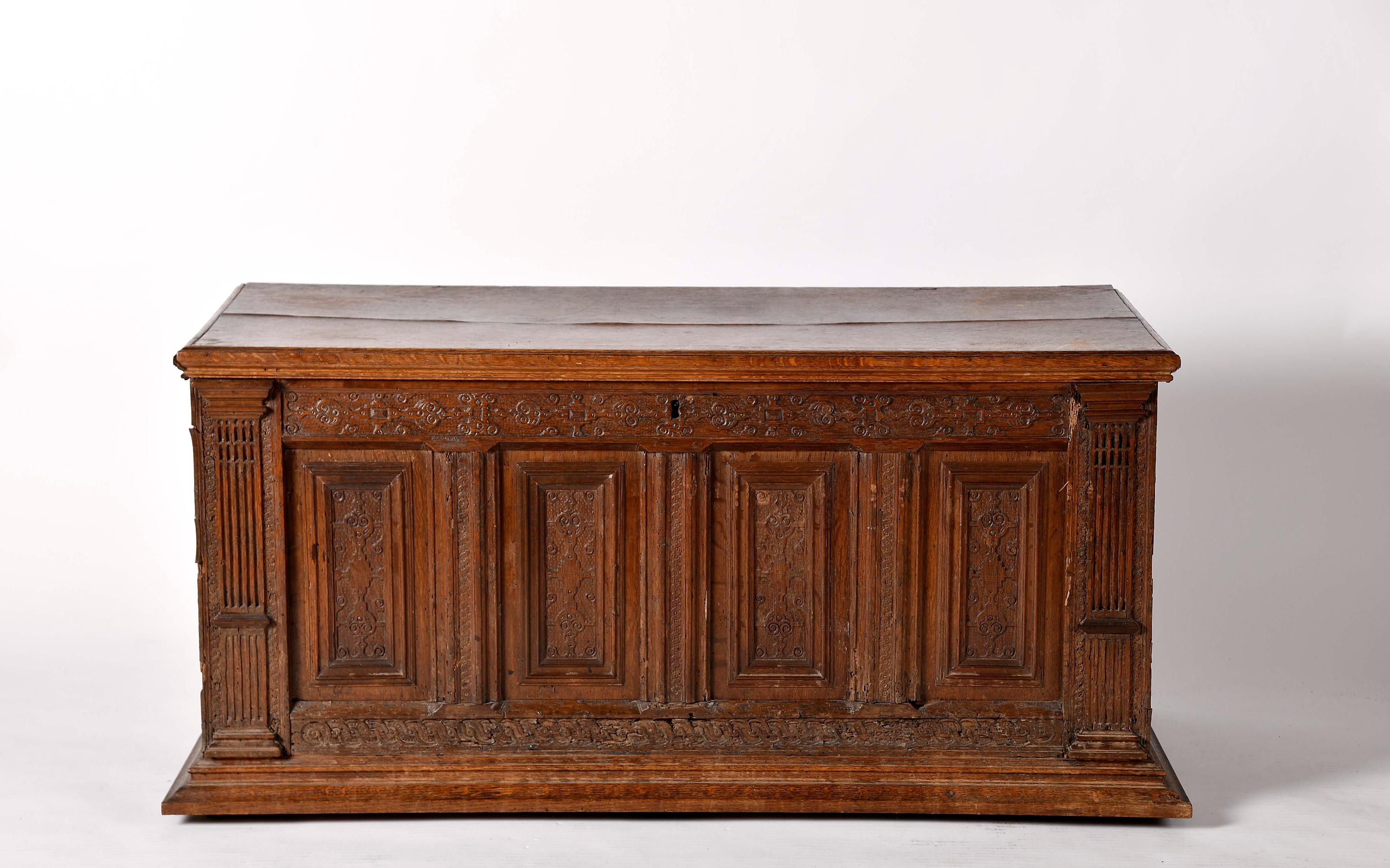 Arca renascentista carvalho frisos, frente e laterais com painéis com centros relevados em talha-baixa, colunas gomadas, interior com escaninho Europeia séc. XVI faltas e defeitos, vestígios de insectos xilófagos Dimensões (altura x comprimento x largura) - 68 x 137 x 57 cm