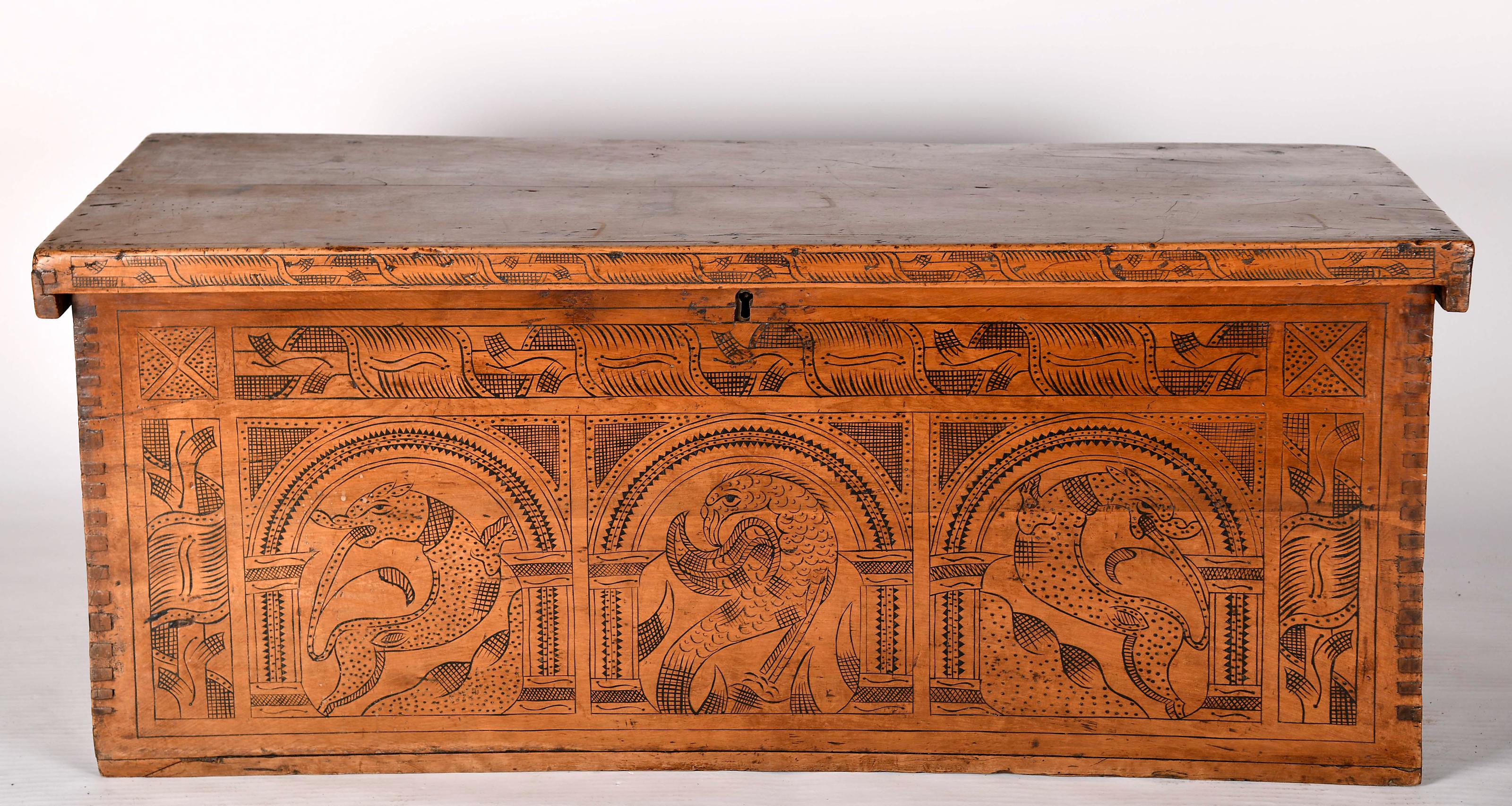 Arca de grafitados renascentista zimbro (ou cedro) frente com decoração incisa com fundos preenchidos a massa negra (noz de gralha) "Animais fantásticos e motivos vegetalistas entre arcos classicistas", topos das pranchas puncionados, interior com escaninho Portuguesa - Açores séc. XVI/XVII falta do soco, restauros, pequenos defeitos, ferragens em ferro não originais, falta do escaninho, vestígios de insectos xilófagos Dimensões (altura x comprimento x largura) - 54 x 134,5 x 57 cm Notas: este tipo de arcas foi estudado em FERRÃO, Bernardo - "Mobiliário Português - dos primórdios ao maneirismo - volume quarto - Anexos". Porto: Lello & Irmão - Editores, 1990, pp. 7-35, reproduzindo diversos exemplares.Para arca de decoração incisa com animais fantásticos semelhantes ver FREIRE, Fernanda Castro - "Mobiliário - volume II". Lisboa: Fundação Ricardo do Espírito Santo Silva, 2001, p. 43.tásticos e motivos vegetalistas", topos das pranchas puncionados