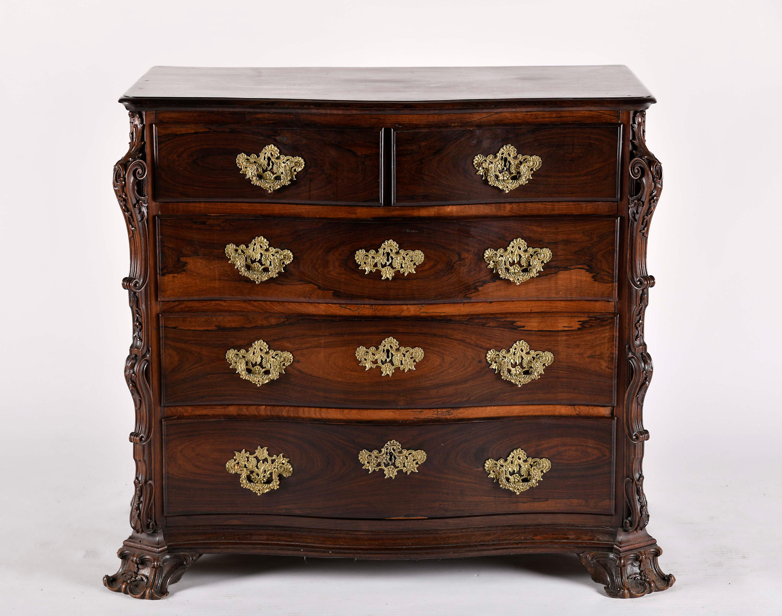 Cómoda D. José (1750-1777) pau-santo ilhargas e pés entalhados, ferragens em bronze relevado, vazado e dourado Portuguesa pequenos defeitos, vestígios de insectos xilófagos nos painéis das costas Dimensões (altura x comprimento x largura) - 93 x 100,5 x 55 cm Notas: vd. exemplar semelhante em FREIRE, Fernanda Castro - "Mobiliário - II volume". Lisboa: Fundação Ricardo do Espirito Santo Silva, Museu-Escola de Artes Decorativas Portuguesas, 2002, pp. 108-109.