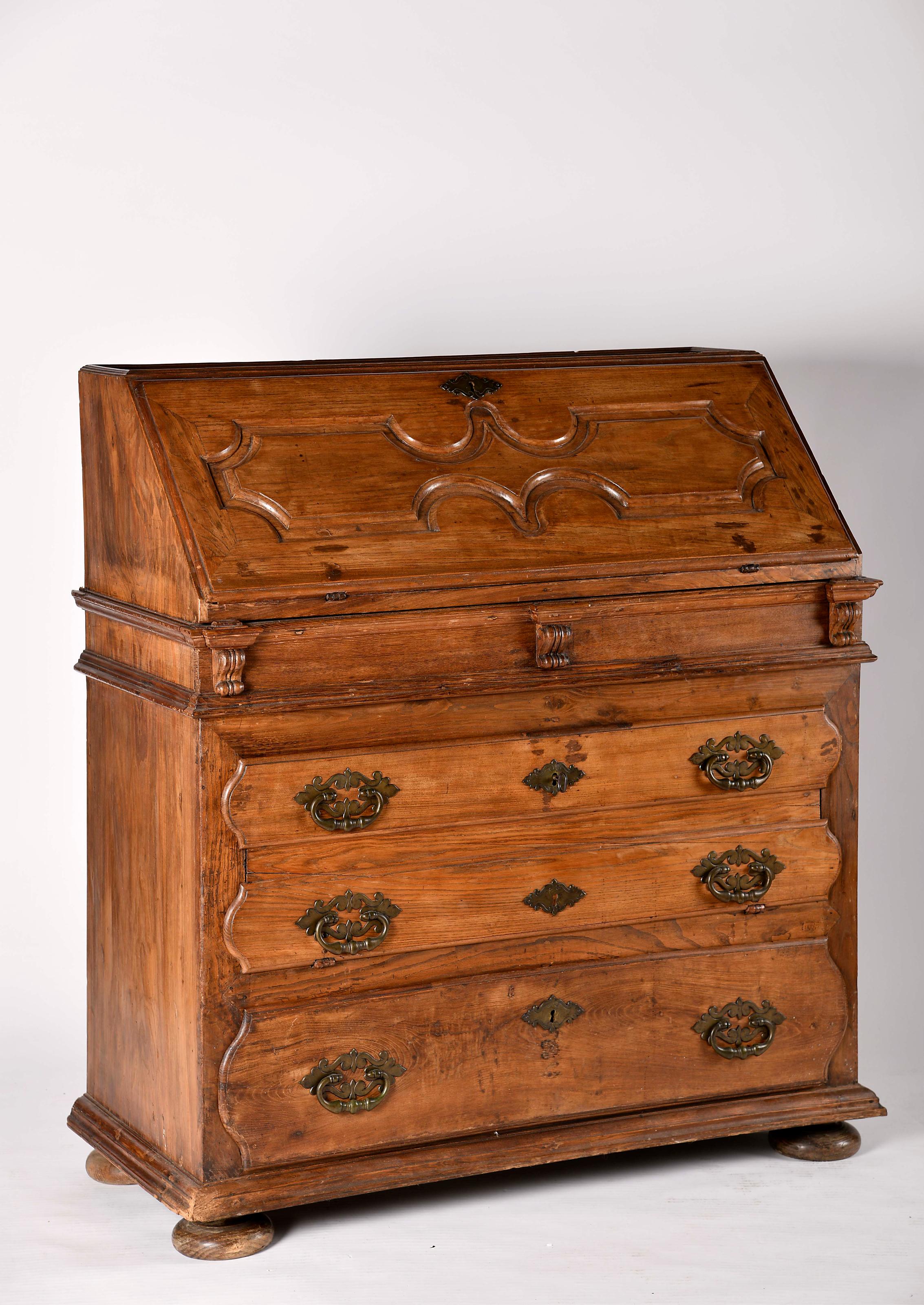 Papeleira rústica D. João V (1706-1750) castanho frentes do tampo e das gavetas moldadas, gaveta estreita superior/segredo sem puxadores, dois gavetões superiores com frente de abater única, interior com arco, escaninhos, gavetas e segredos, ferragens em bronze recortado, vazado e gravado Portuguesa pequenas faltas e defeitos, ligeiros vestígios de insectos xilófagos Dimensões (altura x comprimento x largura) - 130 x 120 x 57 cm