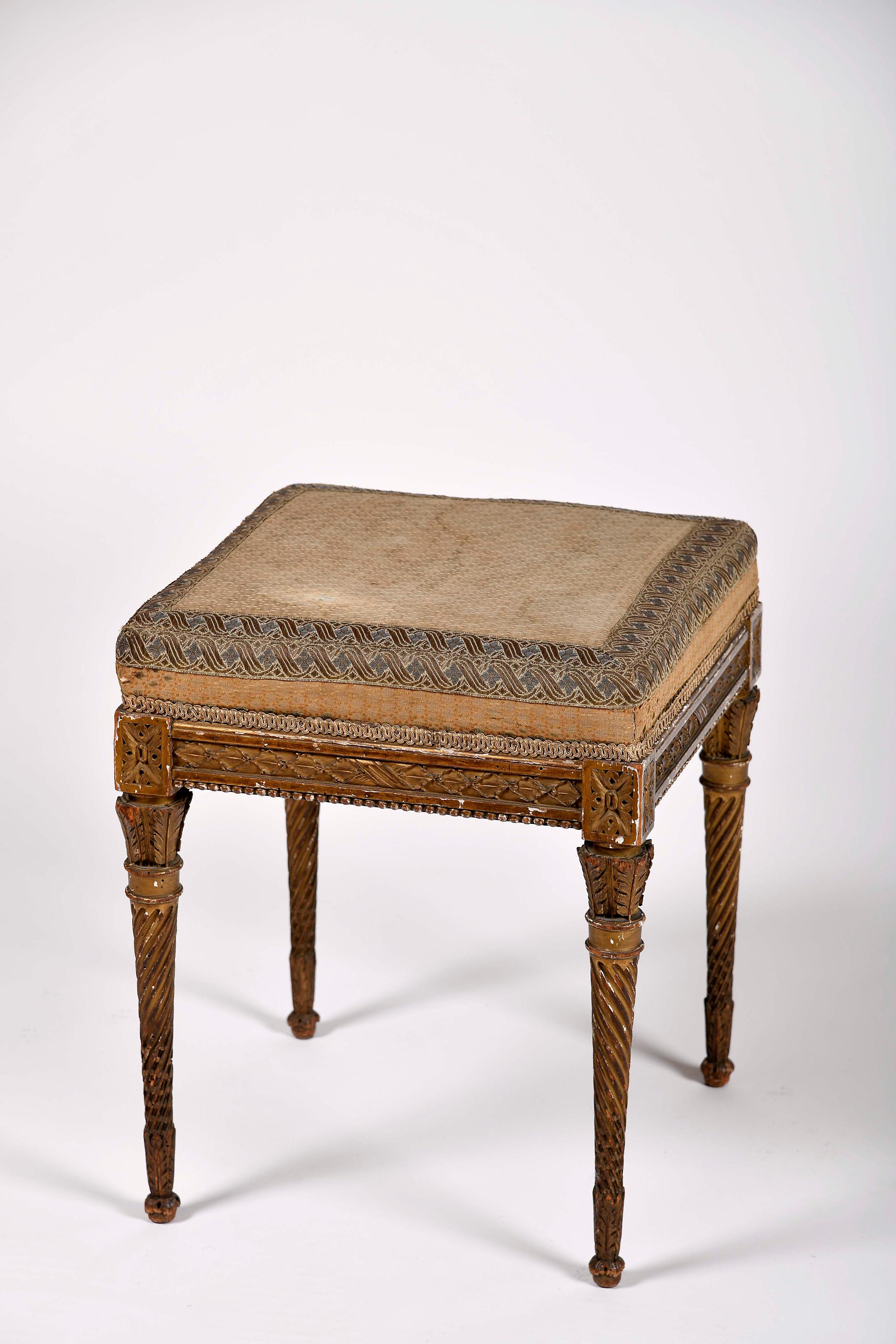 Banco Luís XVI (1774-1791) madeira entalhada e dourada assento estofado Francês pequenos defeitos, pequenas faltas no dourado, vestígios de insectos xilófagos Dimensões (altura x comprimento x largura) - 48 x 39 cm