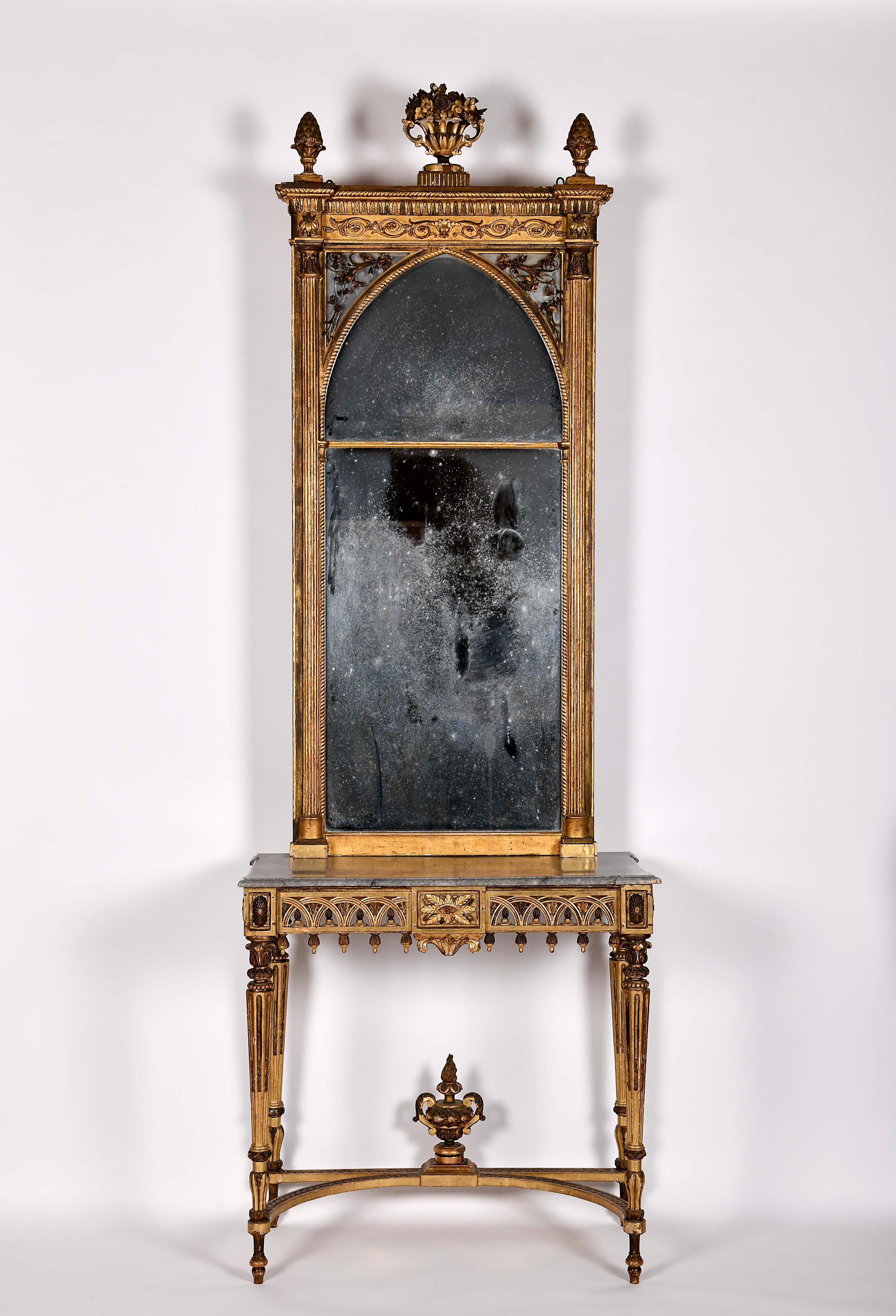 Tremó D. Maria I (1777-1816) madeira entalhada e dourada "Parras e cachos de uvas" topo com pináculos "Pinha", e centro "Ânfora com flores", aplicações em metal "Folhas", tampo de mármore Português pequenas faltas e defeitos, tampo com canto partido e colado Dimensões (altura x comprimento x largura) - 294 x 102 x 53 cm