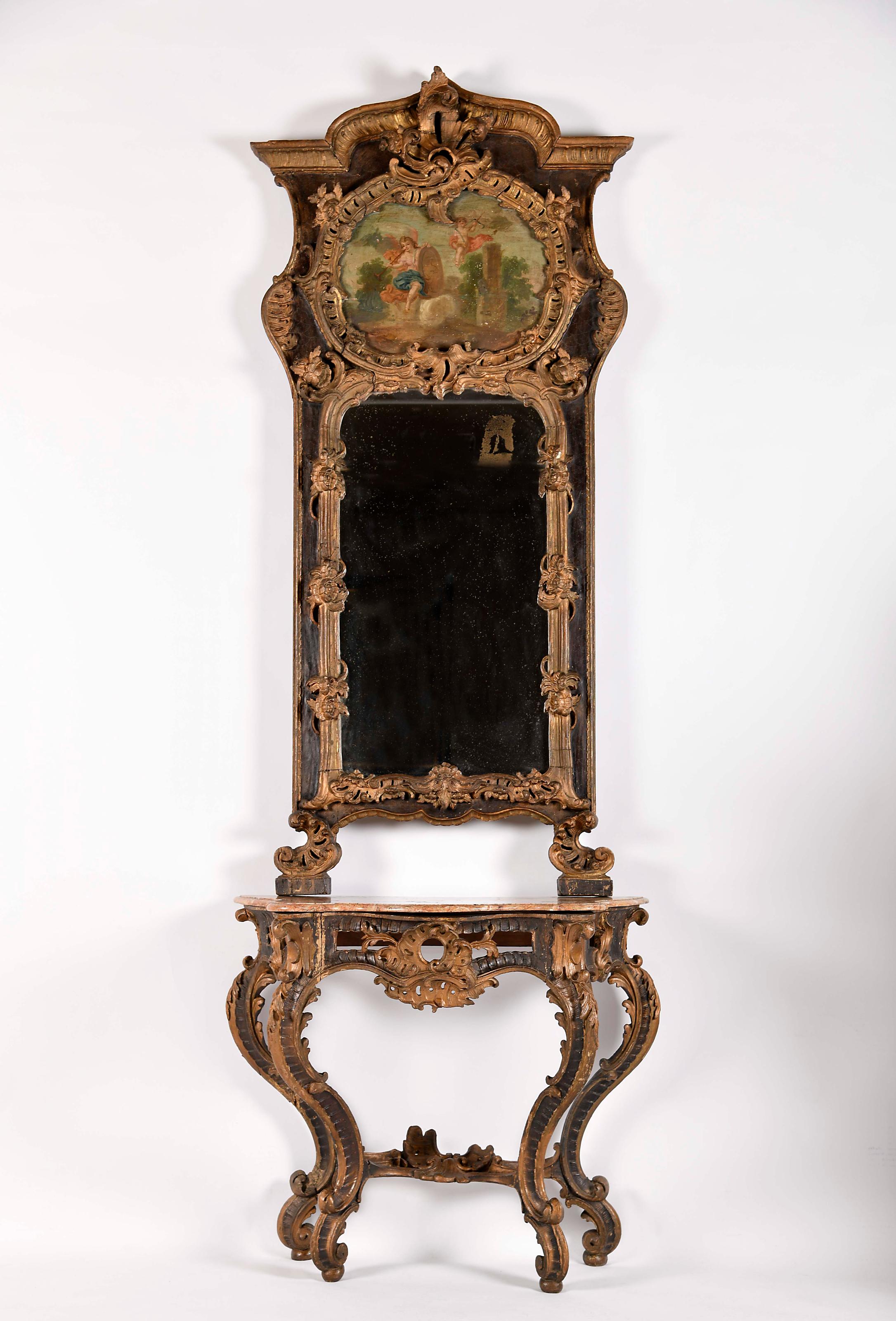 Tremó D. José (1750-1777) madeira entalhada, vazada e dourada cimalha do alçado com pintura a óleo sobre madeira "Anjos", tampo em mármore Português colagens, faltas e defeitos Dimensões (altura x comprimento x largura) - (credência) 83 x 102 x 44,5 cm; (espelho) 196 x 88,5 cm