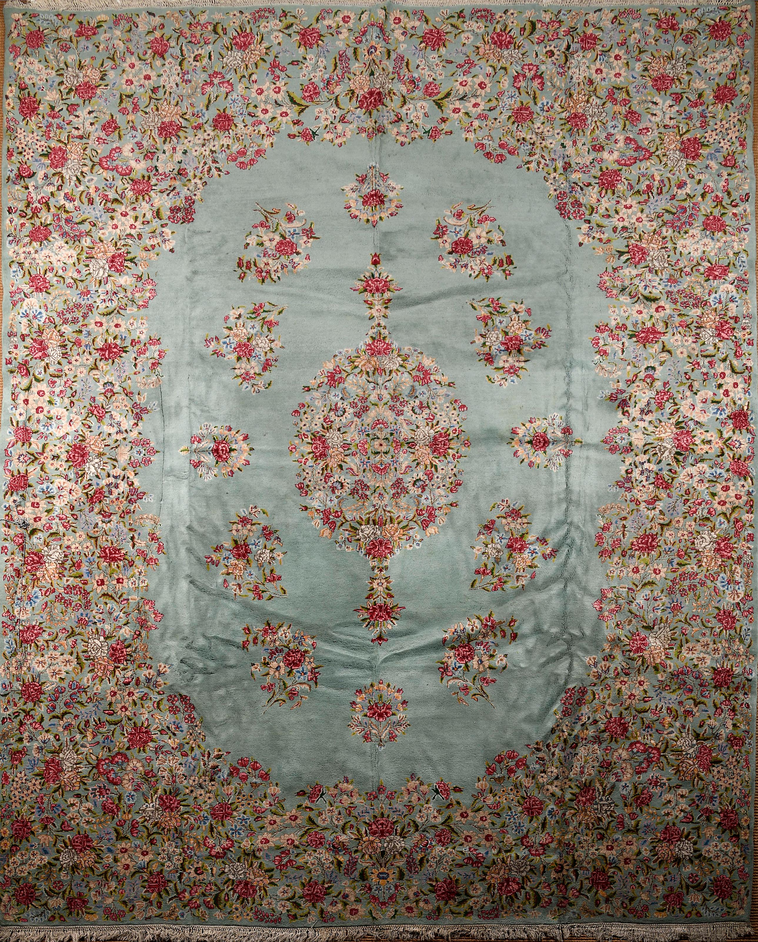 Tapete Kirman fio de lã e de seda sobre algodão decoração policromada "Flores" com medalhão central sobre fundo azul turquesa Iraniano séc. XX (4º quartel) pequenos sinais de uso Dimensões (altura x comprimento x largura) - 414 x 297 cm