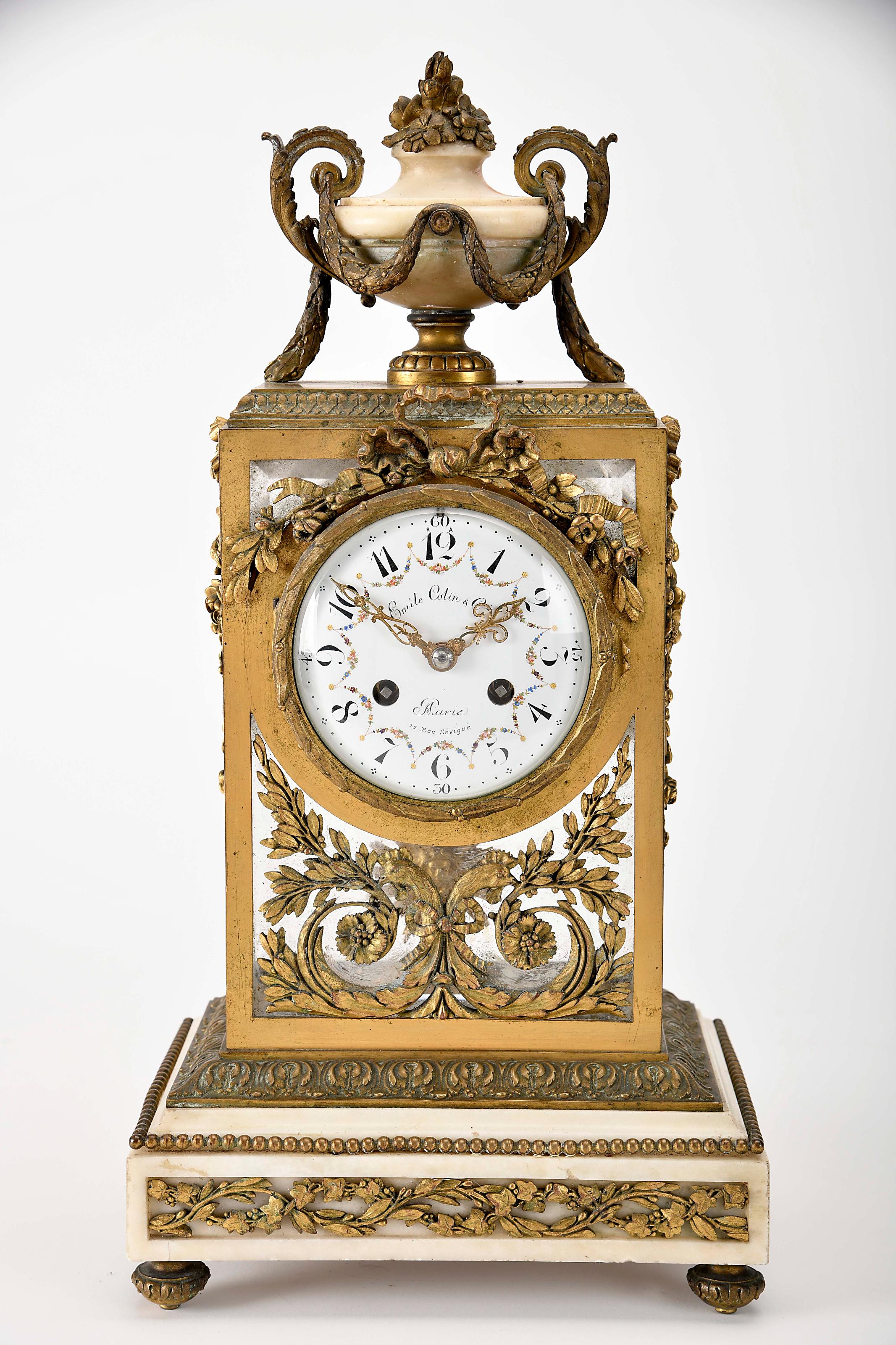 Relógio de mesa "Urna" bronze relevado, dourado e vazado base e urna em mármore, mostrador em esmalte branco com numeração árabe a negro e decoração policromada "Grinaldas de flores", autonomia de oito dias, toca horas e meias horas em campainha, regulação da marcha no mostrador Francês séc. XIX (4º quartel) pequenas esbeiçadelas, oxidação e desgaste, mecanismo a necessitar de revisão, com chave mostrador marcado EMILE COLIN & Cie. - A PARIS - 29, RUE SÈVIGNÉ Dimensões (altura x comprimento x largura) - 45 x 23 x 16,5 cm