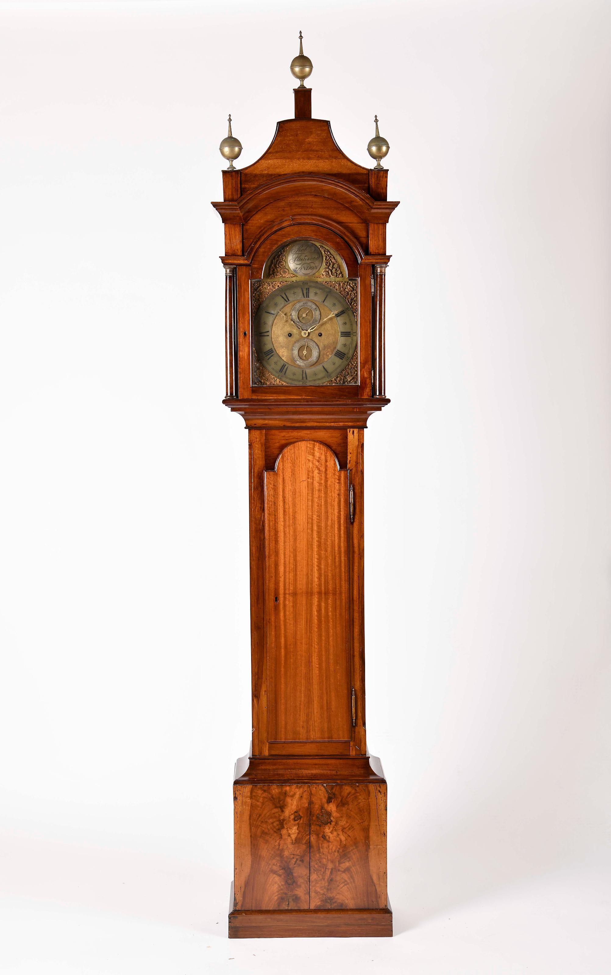 Relógio de caixa alta Jorge III (1760-1820) caixa em mogno e folheado de raiz de mogno com aplicações em latão mostrador em latão polido, granitado, gravado e prateado, aplicações em latão relevado e dourado, autonomia de oito dias, toca horas, calendário mensal Inglês séc. XVIII (3º quartel) restauros e modificações, pequenas faltas e defeitos, mecanismo a necessitar de revisão mostrador marcado ROB[ER]T FLEETWOOD - LONDON Dimensões (altura x comprimento x largura) - 258,5 x 45 x 24 cm