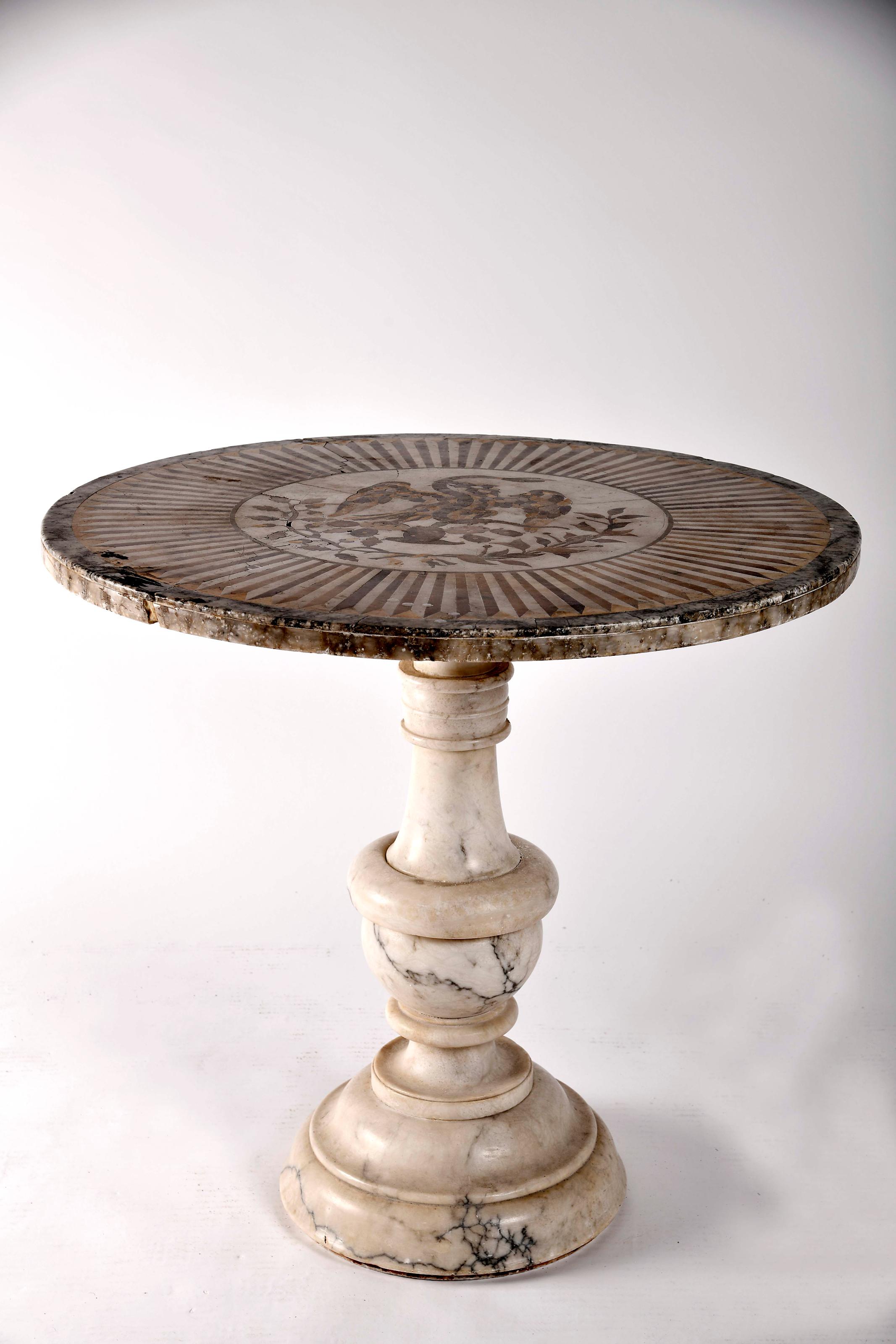Mesa redonda de coluna central tampo em pedra dura de diversas colorações com símbolo da República do México - "Águia atacando cobra" tampo debruado a mármore cinzento, coluna em mármore branco Europeia séc. XIX (2ª metade) tampo com pequenos restauros e pequenos defeitos Dimensões (altura x comprimento x largura) - 77 x 82,8 cm