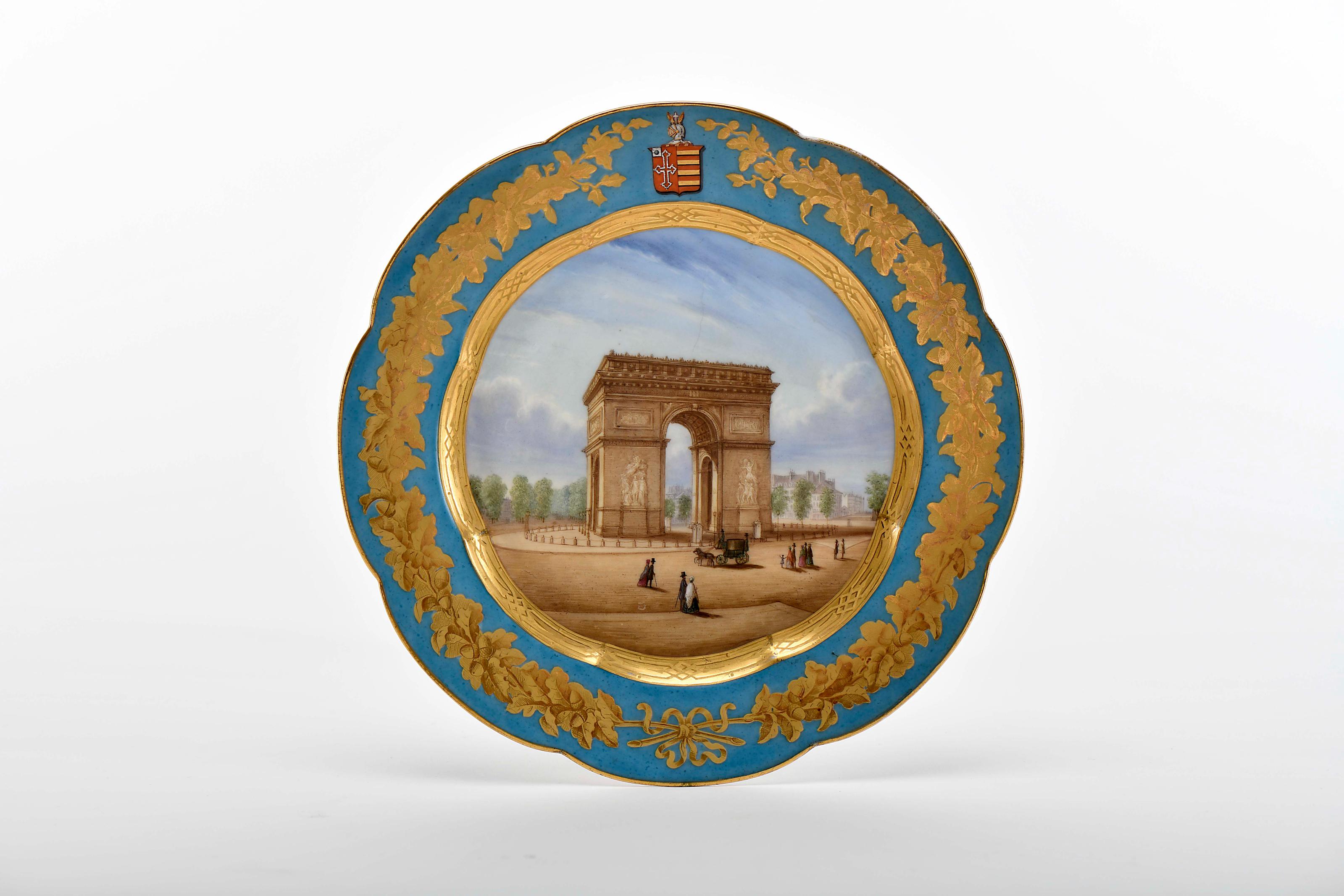Prato recortado porcelana decoração policromada "Paris - Arco do Triunfo", aba com decoração a dourado "Flores" sobre fundo azul com armas do 1º visconde e 1º conde de São Mamede - Rodrigo Pereira Felício (1820-1872) Francês séc. XIX (meados) ligeiro desgaste no dourado Dimensões (altura x comprimento x largura) - 23,5 cm Notas: vd. BRANCANTE, Eldino da Fonseca - "O Brasil e a Cerâmica Antiga". São Paulo: Cia. Lithographica Ypiranga, 1981, p. 617.