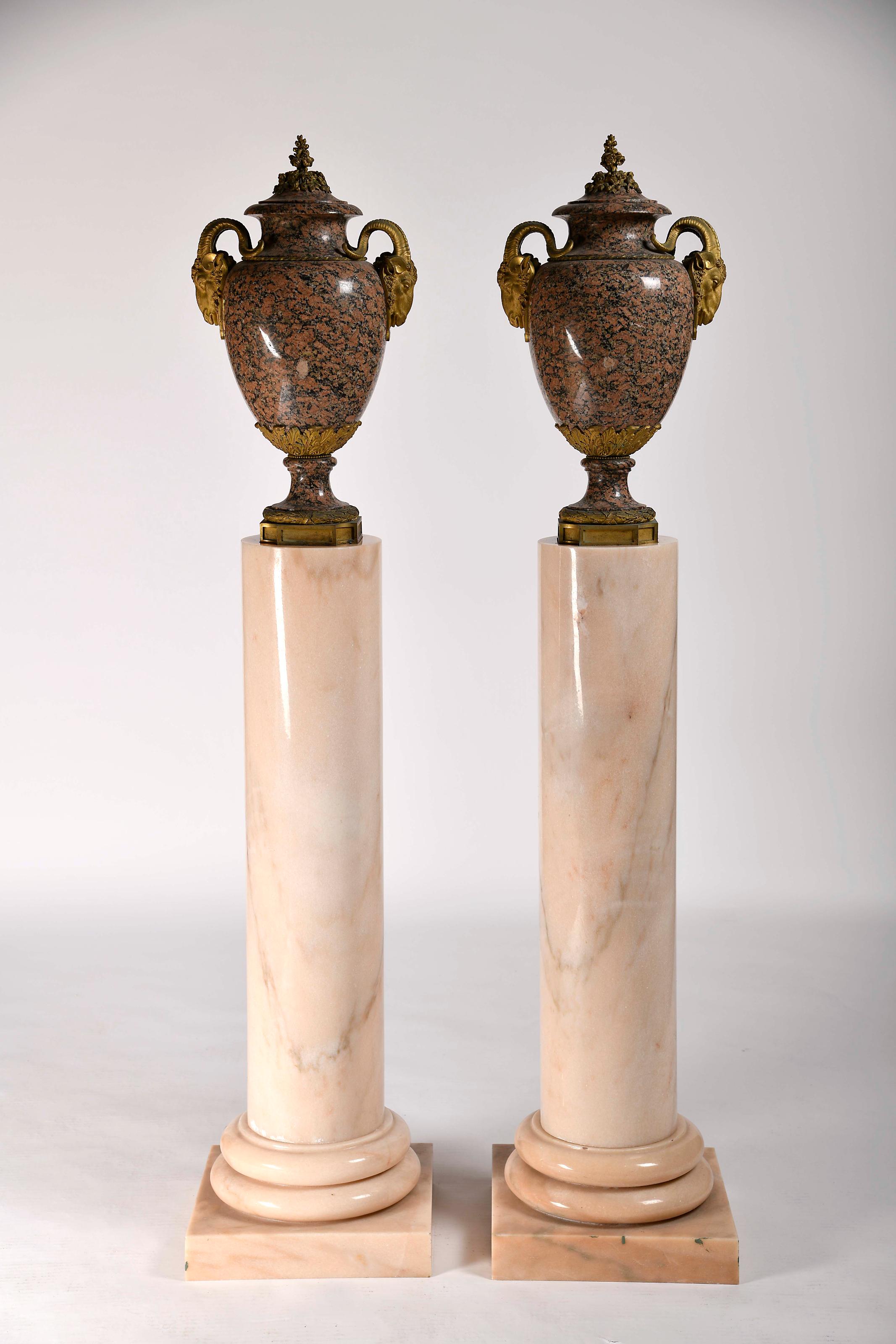 Par de urnas com tampas mármore em tons de rosa e negro aplicações em bronze relevado e dourado "Cabeças de bode", colunas em mármore Francesas séc. XIX pequenas esbeiçadelas Dimensões (altura x comprimento x largura) - (urnas) 60 x 36 cm; (colunas) 114 cm