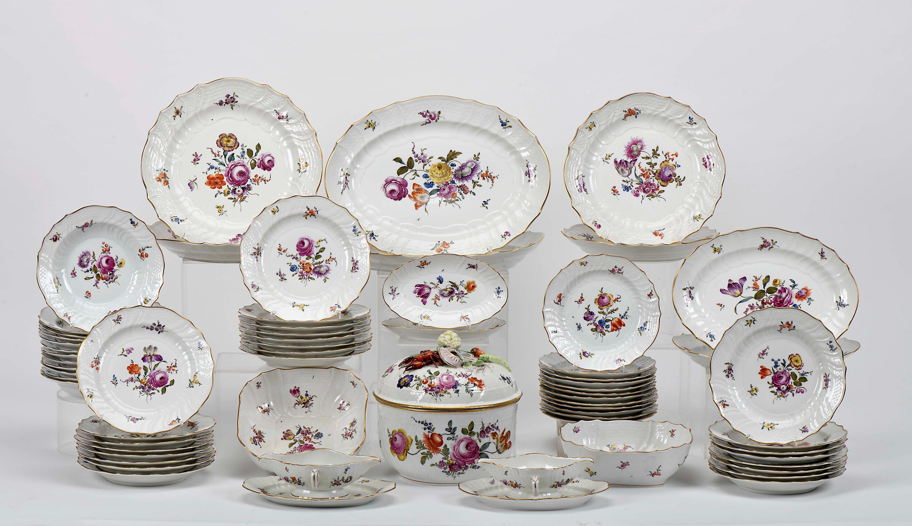 Serviço de mesa para doze pessoas porcelana de Ludwigsburg decoração policromada e dourada sobre fundo relevado "Flores", composto por terrina com pomo relevado "Lagosta, legumes e frutos", duas saladeiras, dois pares de pratos redondos de servir, dois pares de travessas ovais, par de molheiras com base, duas azeitoneiras, doze pratos de sopa, vinte e quatro pratos rasos e doze pratos de sobremesa Alemão séc. XIX/XX lagosta com falta numa pata, uma molheira com cabelo e pequena falha, um prato redondo de servir com muitos cabelos, outras peças comínfimas esbeiçadelas, ínfimo desgaste na decoração marcado Dimensões (altura x comprimento x largura) - (terrina) 26,5 cm Notas: encontra-se reproduzido em "Anuário de Antiguidades - 2001". Lisboa: Edições INAPA, 2002, p. 102, nº 12.