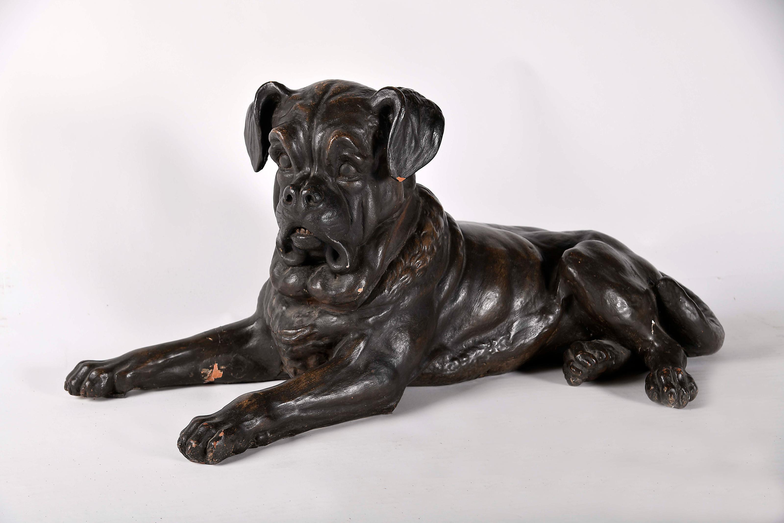 Cão deitado escultura em barro patinado simulando bronze Europeia séc. XX duas patas partidas e coladas, pequenas faltas Dimensões (altura x comprimento x largura) - 43 x 94 x 40 cm
