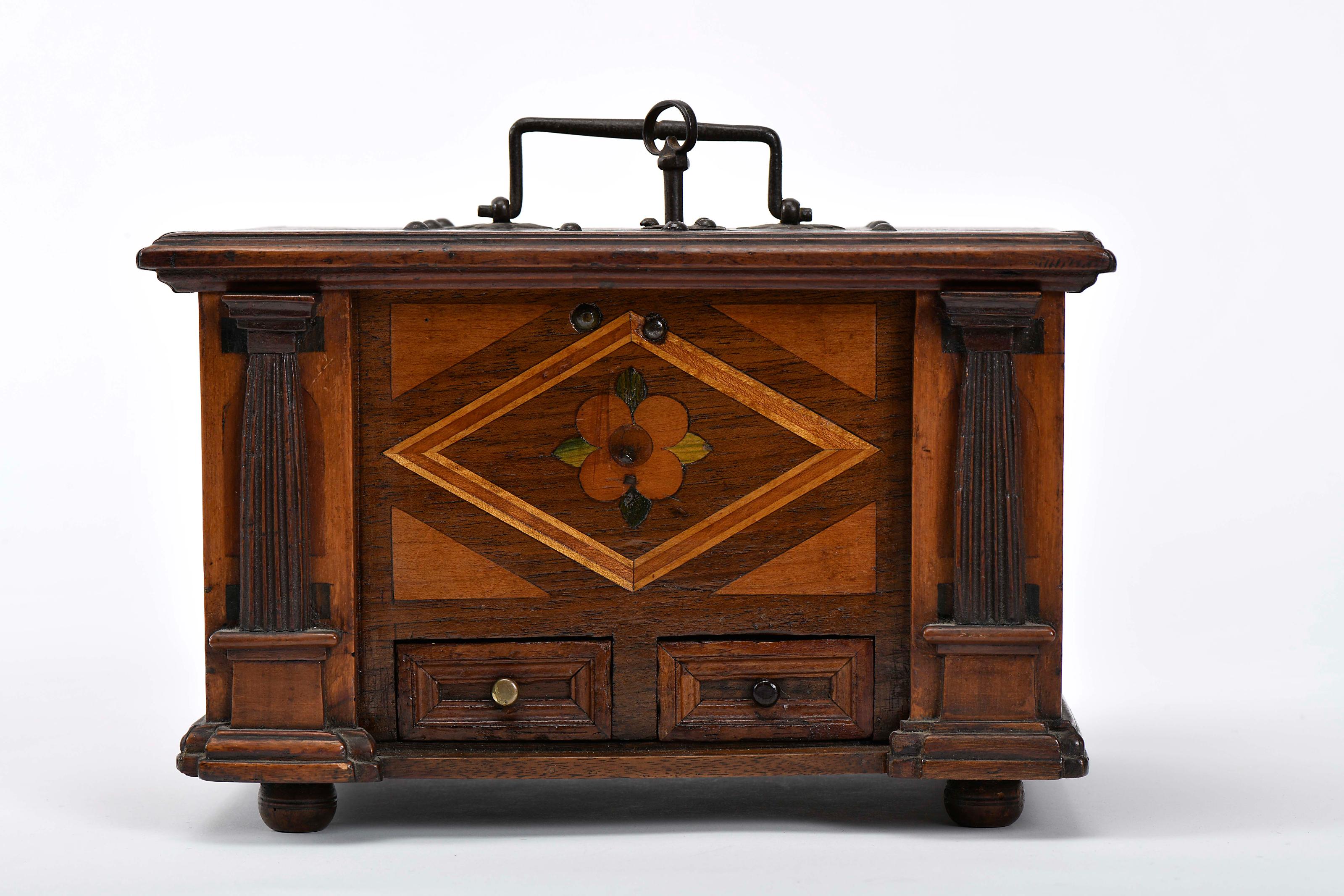 Caixa renascentista nogueira com embutidos de cerejeira, limoeiro, pau-cetim e buxo "Flores" e "Igrejas" frente com placa de subir encobrindo duas pequenas gavetas, aplicações e sistema de fechadura em ferro possuindo no interior decoração cinzelada Alemã séc. XVI pequenas faltas e defeitos Dimensões (altura x comprimento x largura) - 17,5 x 27,8 x 21 cm
