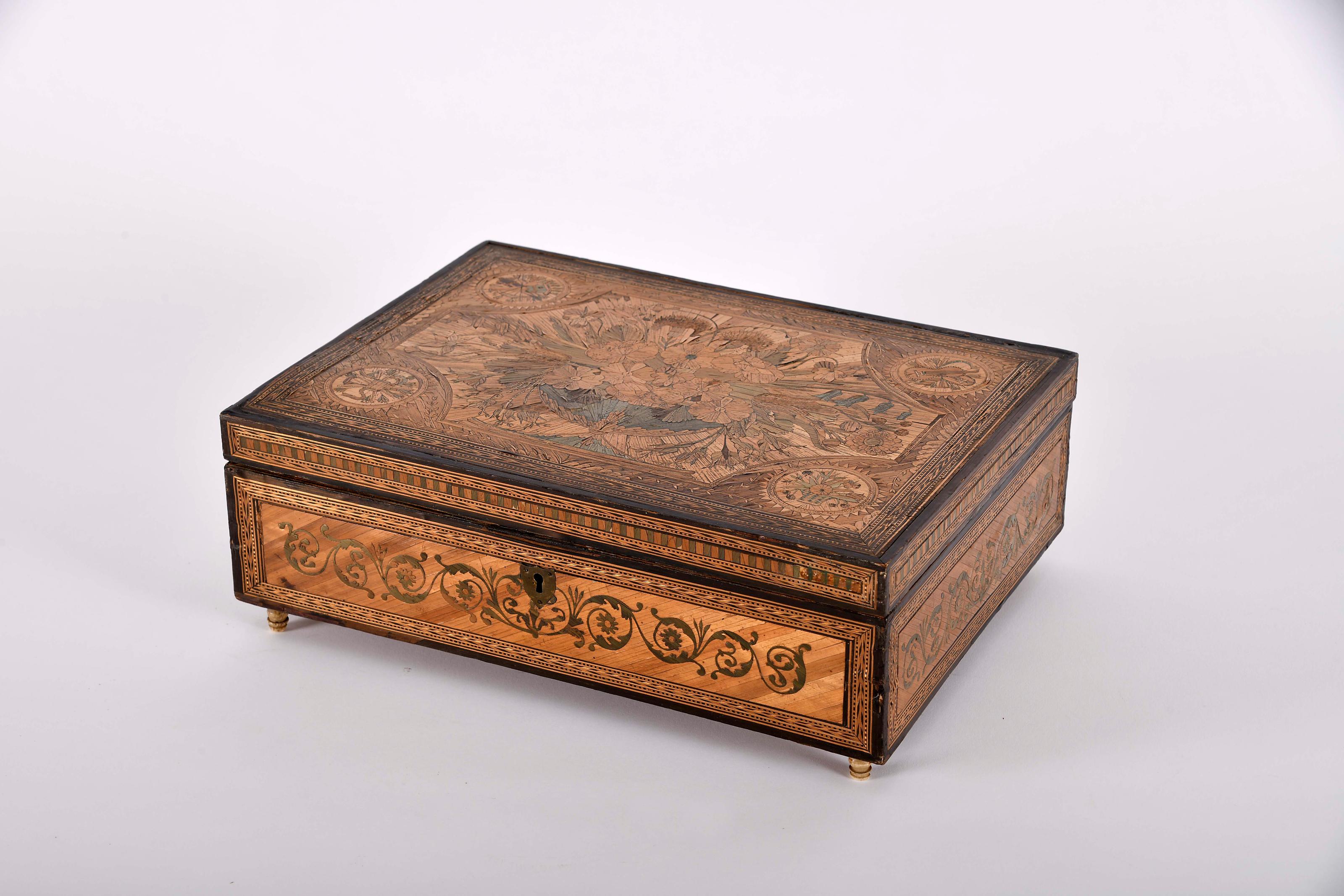 Caixa de costura neoclássica madeira revestimento integral a marchetaria de «paille» "Taça com flores, instrumentos musicais e bélicos, cesto com flores e enrolamentos vegetalistas", interior da tampa com espelho, interior de dois andares com diversos receptáculos, tampas com marchetaria de «paille» policromada "Marinha - nau e veleiros em porto de mar com edifício com bandeira francesa", "Vasos com flores", "Facho e aljava" e "Lutas contra leão", pés em osso torneado Francesa séc. XIX (1º quartel) pequenas faltas e defeitos, faltas no espelhado Dimensões (altura x comprimento x largura) - 12 x 33,7 x 24,3 cm