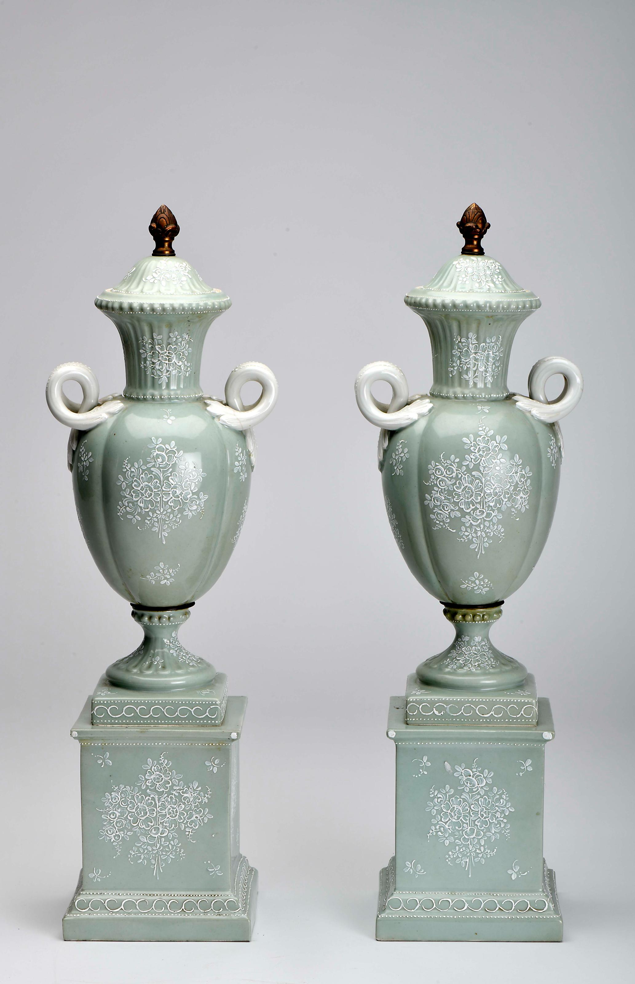 Par de urnas com tampas porcelana de Sanson decoração «Celadon» com relevos a branco "Flores", pegas relevadas a branco, pomo das tampas em bronze relevado e dourado Francesas séc. XIX uma pega com restauro, pequeno cabelo no fundo de uma das bases marcadas Dimensões (altura x comprimento x largura) - 61 cm