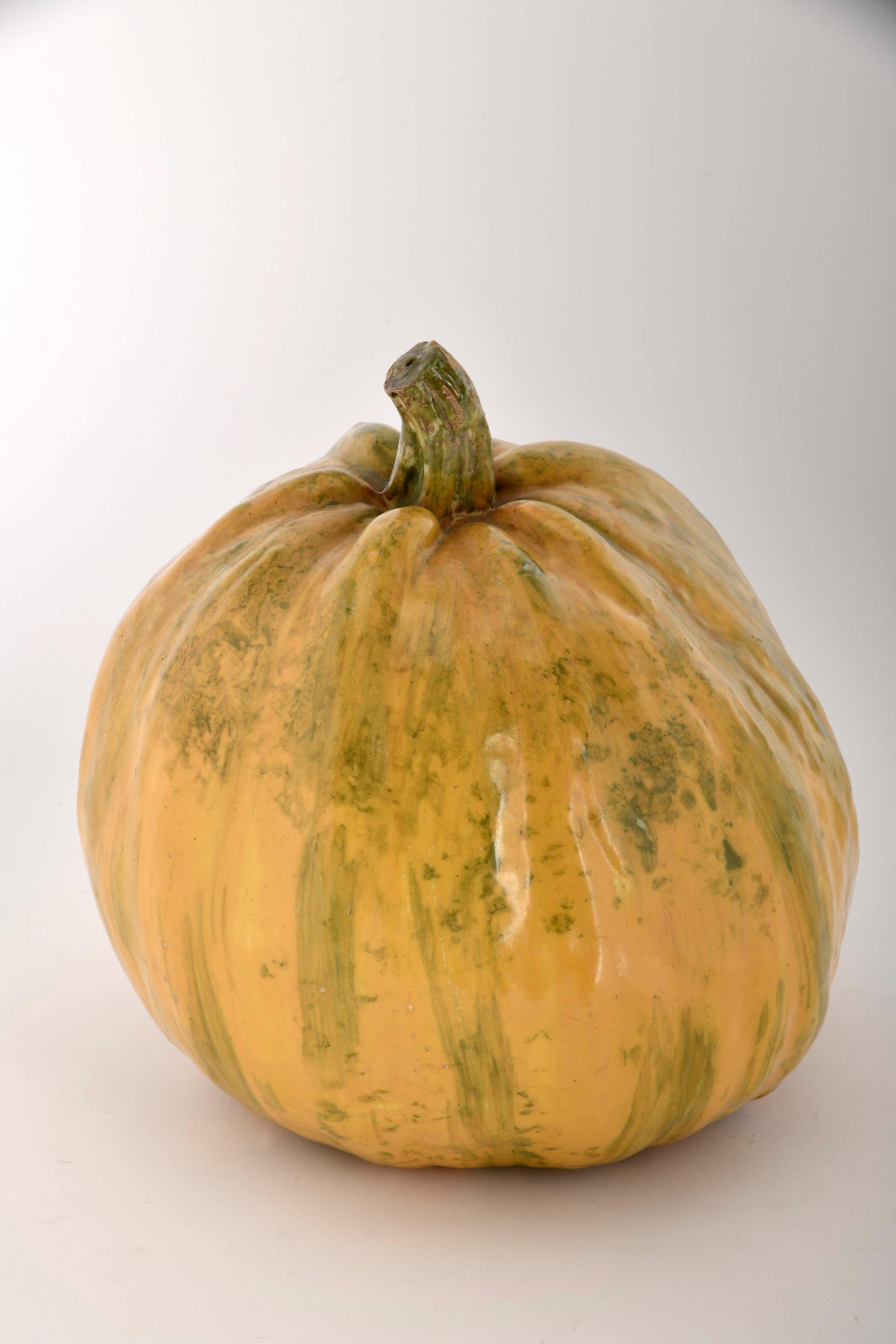 Abóbora escultura em faiança decoração naturalista Europeia séc. XVIII/XIX pequenas esbeiçadelas Dimensões (altura x comprimento x largura) - 35 cm Notas: de acordo com uma tradição familiar reiterada trata-se de uma produção da "Fábrica do Rato".Apesar das diligências efectuadas para o efeito, a Cabral Moncada Leilões não logrou identificar a origem do bem, não podendo descartar a hipótese de a peça ser portuguesa e, inclusive, da Real Fábrica de Louças, ao Rato.