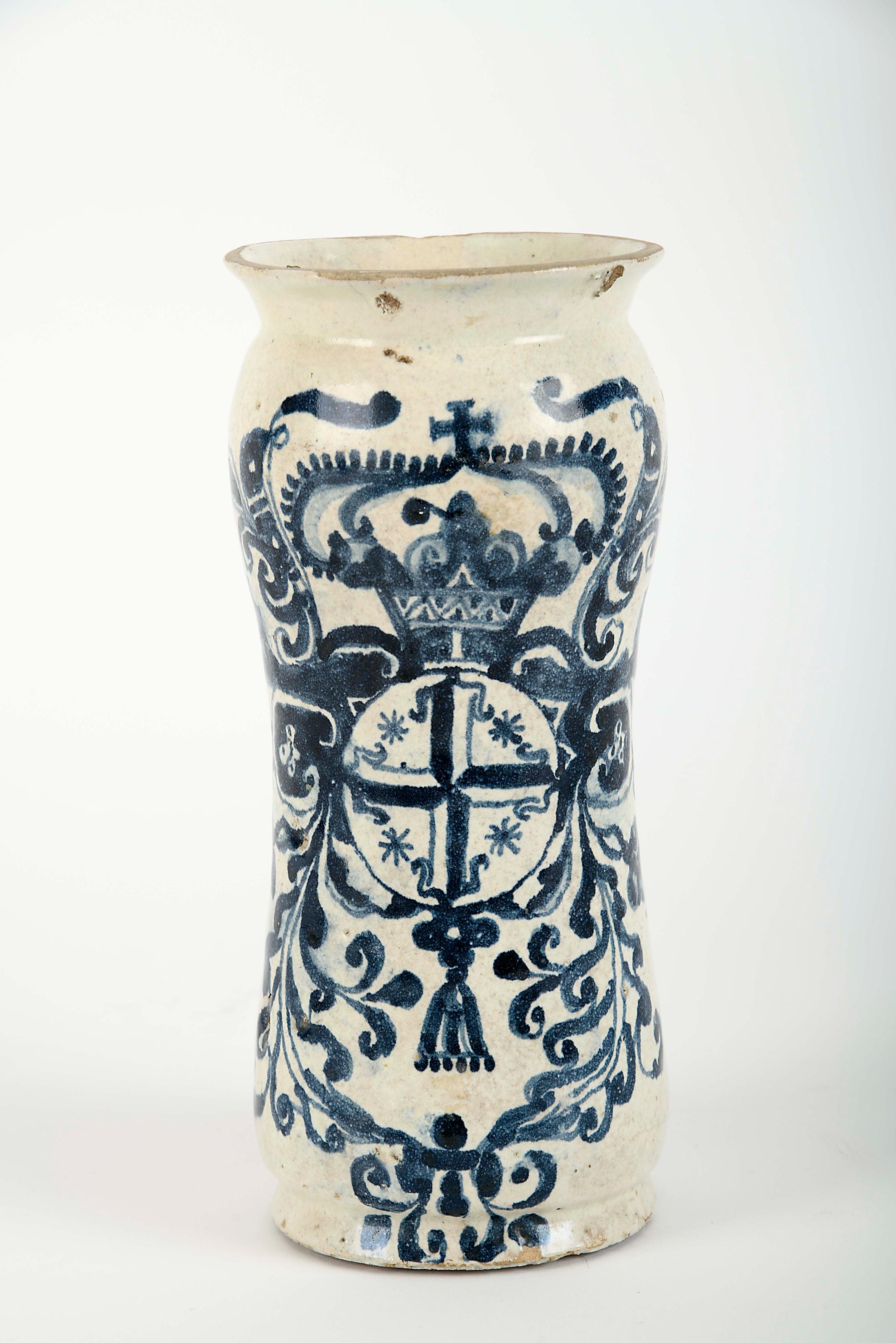 Manga de farmácia faiança decoração a azul com armas da Ordem de São Domingos Portuguesa séc. XVII/XVIII esbeiçadelas restauradas, parte do bordo aparado Dimensões (altura x comprimento x largura) - 26,8 cm Notas: vd. MONCADA, Miguel Cabral de - "Faiança Portuguesa - séc. XVI a séc. XVIII". Lisboa: SCRIBE, 2008, p. 129, nº 135; e "Farmácia Portuguesa - Museu da Farmácia - 5000 anos de história". Lisboa: Edições INAPA, 2000, p. 58, nº 42.