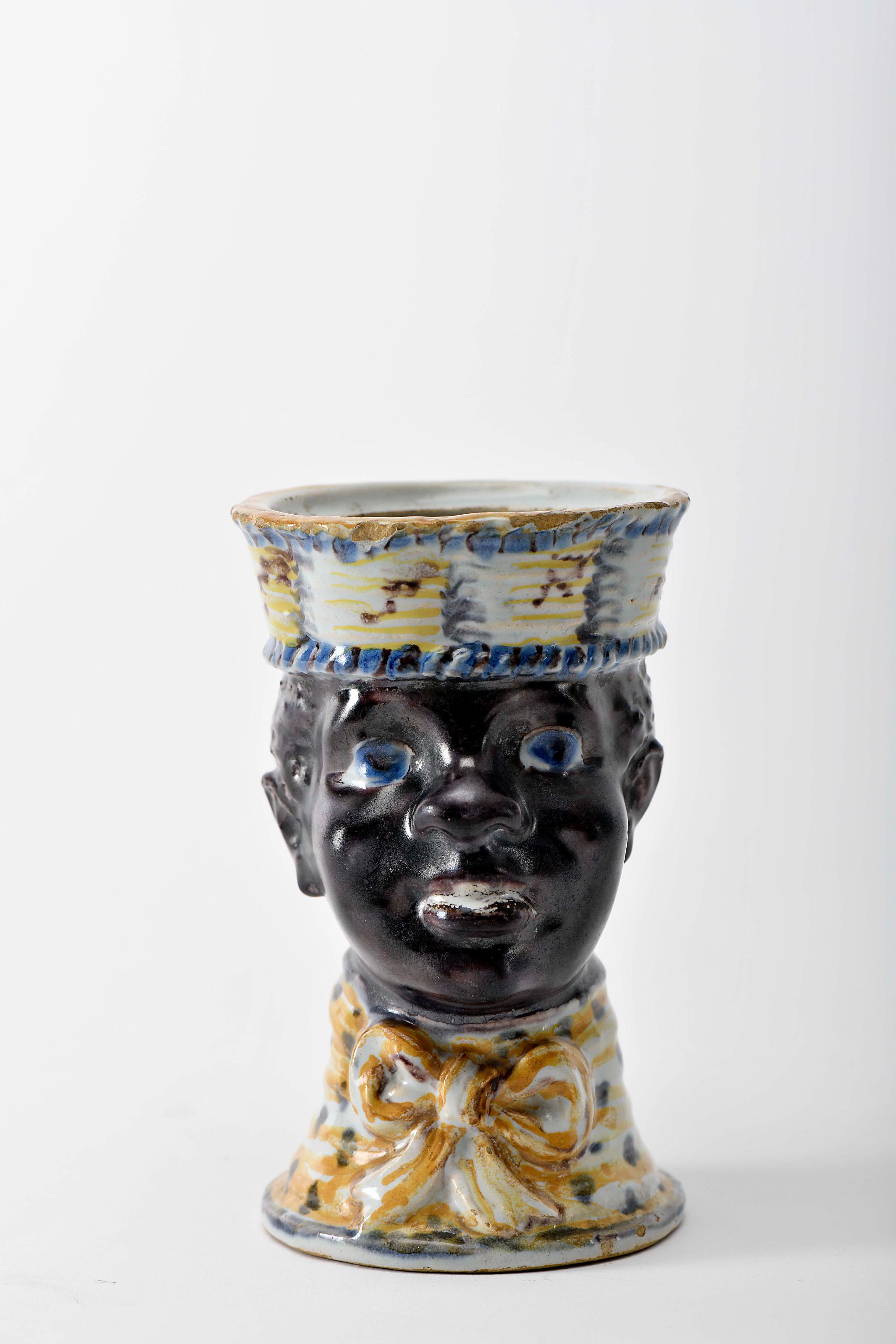Caneca "Cabeça de negra" faiança da Real Fábrica de Louça, ao Rato decoração policromada Portuguesa séc. XVIII/XIX esbeiçadelas, pequenas faltas no vidrado Dimensões (altura x comprimento x largura) - 12,5 cm Notas: exemplar semelhante integrou a exposição "Real Fábrica de Louça, ao Rato", Museu Nacional do Azulejo/ Museu Nacional de Soares dos Reis, Lisboa e Porto, 2003, encontrando-se representado no respectivo catálogo, p. 407, nº 185. Outro exemplar idêntico integrou a Colecção António Capucho, encontrando-se representado em ARRUDA, Luísa d`Orey Capucho; HENRIQUES, Paulo; PAIS, Alexandre Nobre; e MONTEIRO, João Paulo - "António Capucho; retrato do homem através da colecção - cerâmica portuguesa do século XVI ao século XX", Livraria Civilização Editora, Porto, p. 111, nº 51.