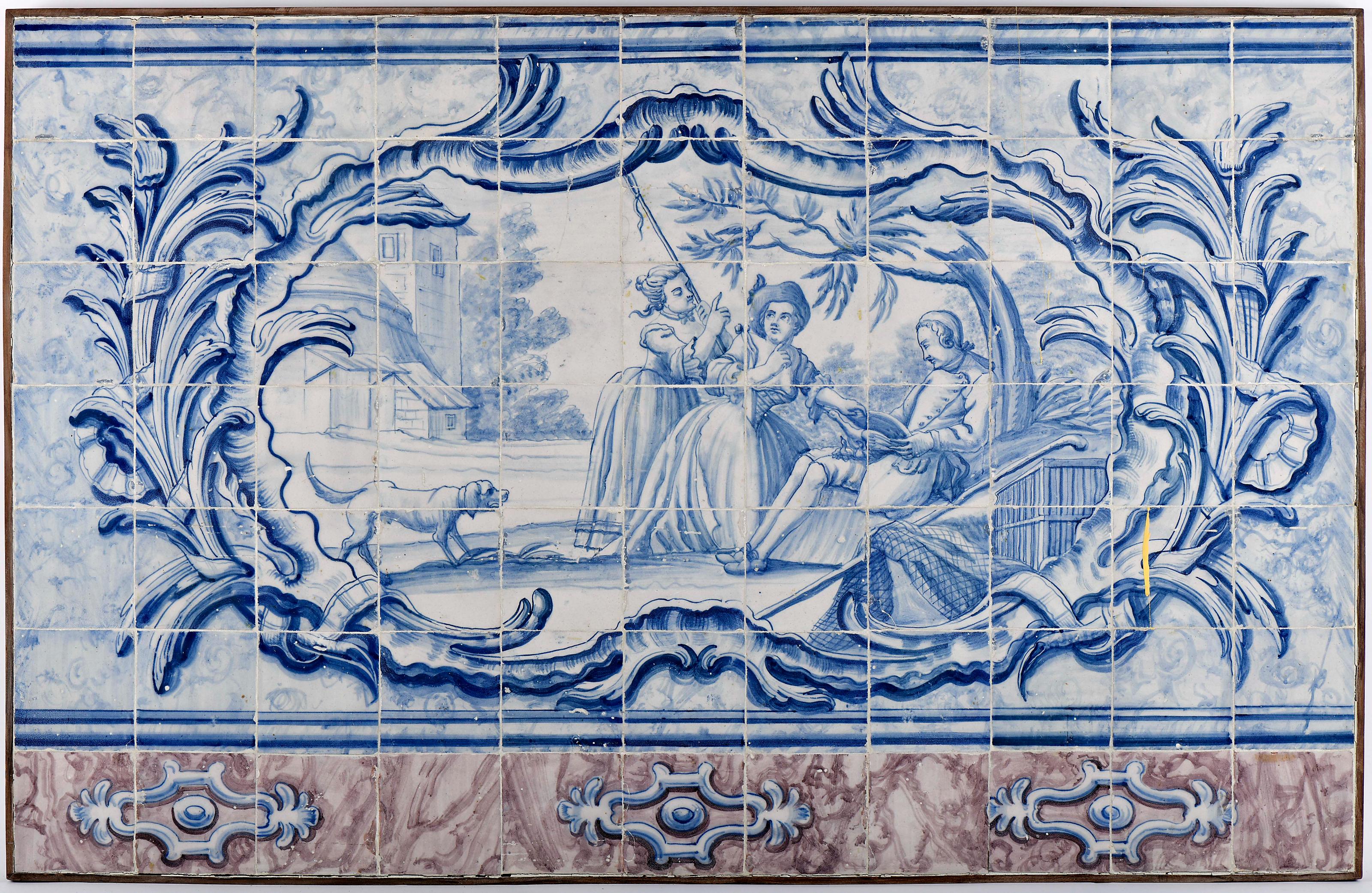 Figuras no jardim D. José (1750-1777) painel de setenta e sete azulejos decoração a azul, barra inferior a vinoso e azul Português diversos azulejos partidos e restaurados, pequenas faltas em alguns azulejos, pequenas faltas e defeitos nos cantos e bordos de diversos azulejos Dimensões (altura x comprimento x largura) - 100 x 157 cm
