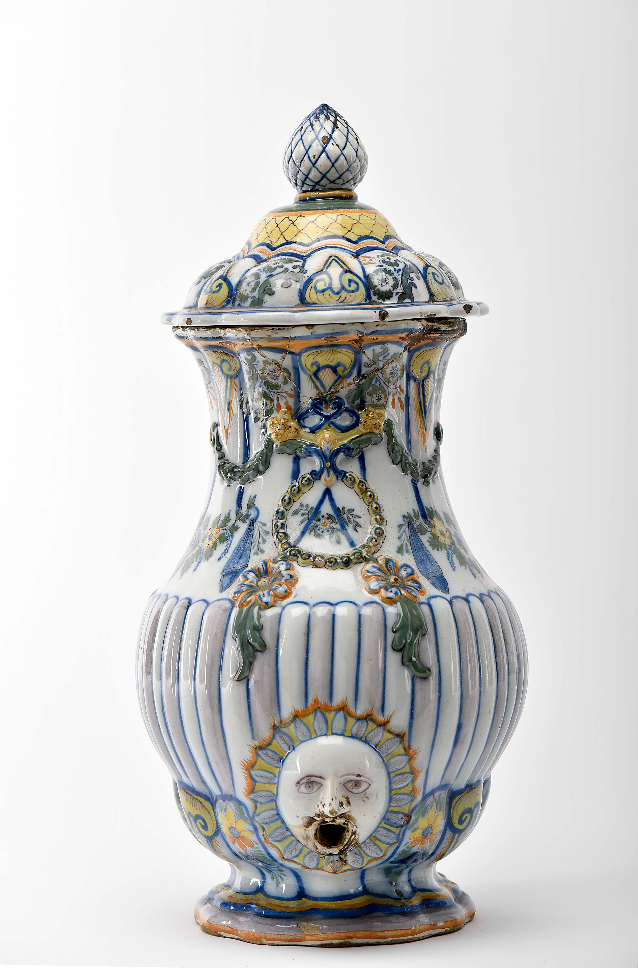 Depósito de suspensão com tampa faiança decoração gomada, relevada e policromada "Grinaldas de flores" e "Flores", reserva com monograma "A", arranque da torneira relevado "Mascarão", pomo da tampa esculpido "Pinha" Português séc. XVIII/XIX depósito com restauro na parte superior, faltas no vidrado, esbeiçadelas Dimensões (altura x comprimento x largura) - 49,8 cm