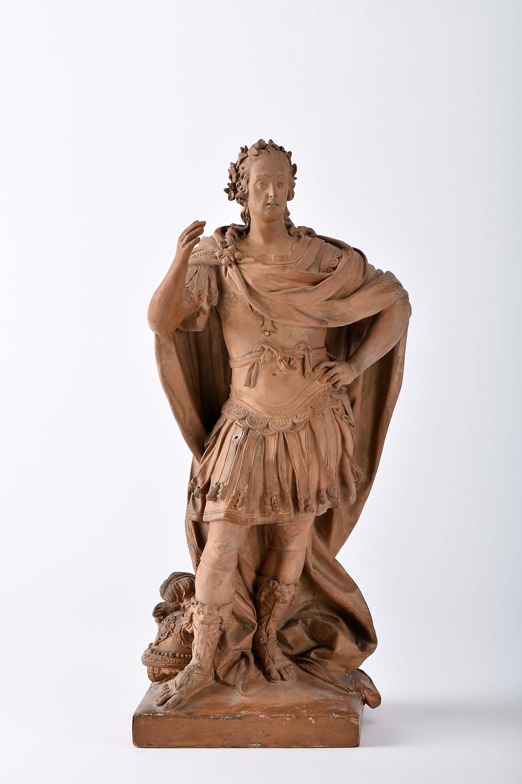 JOAQUIM MACHADO DE CASTRO - 1731-1822 Modelo para a Estátua pedestre de D. José I (1714-1777) escultura em barro braço direito integralmente refeito com falta do ceptro, pequenos restauros, pequenas faltas Dimensões (altura x comprimento x largura) - 40 cm Notas: Modelo de barro para uma estátua pedestre de D. José IO modelo em cera patinada a dourado para uma estátua pedestre de D. José I, pertencente ao acervo do Museu de Lisboa (MC.ESC.0288), adquire agora uma nova leitura com o surgimento de um modelo em barro da mesma dimensão, praticamente idêntico, de Joaquim Machado de Castro. Tal como o modelo em cera patinada da estátua equestre, de uma coleção particular e apresentado em 2012 na exposição "O Virtuoso Criador. Joaquim Machado de Castro (1731-1822)", no Museu Nacional de Arte Antiga, também este exemplar de barro poderá corresponder a uma fase inicial de conceção de uma estátua destinada ao espaço público.Com o aparecimento deste modelo de barro, o exemplar em cera passa a ser entendido como o ponto de partida de um projeto escultórico para uma estátua pedestre de D. José I, possivelmente destinada a uma praça, à semelhança da célebre estátua equestre. O modelo de barro corresponde à primeira etapa do processo de execução da escultura. A figura do rei surge idealizada como um herói romano, envergando couraça com tiras de couro pendentes, e usando grevas à maneira dos soldados romanos. Porém, a coroa de louros sobre a cabeça, o manto, prendido e arranjado em drapeado de toga, afastava qualquer ambiguidade, sublinhando a dignidade régia e o elevado estatuto da personagem representada. Para além disso, a figura apresenta a mão esquerda apoiada sobre a anca, enquanto a direita, que deveria segurar firmemente o cetro, a repousar obliquamente sobre a mesma anca, evidencia umrestauro que alterou a posição do braço. Aos seus pés, ligeiramente recuado atrás do pé direito, encontra-se o elmo ornado com plumas, colocado de modo a reforçar a leitura heroica e clássica da composição.A data proposta para a realização do modelo de cera patinado a dourado fora entre 1772 e 1777. É o intervalo cronológico possível, mas agora que sabemos que o modelo de cera fazia parte de um projeto para realizar uma estátua régia, afigura-se-nos mais plausívelque depois da estátua equestre se tenha desejado ter outra estátua do rei para a segunda praça de Lisboa, o Rossio (numa altura em que ainda não tinha as estátuas e fontes que irá receber no século XIX), e, portanto tenha começado em 1775. A morte do rei dois anos depois, justificaria que a estátua não tenha chegado a ser realizada, uma vez que é agora certo que começara a ser executada.Ana Duarte RodriguesNovembro 2025Vd. RODRIGUES, Ana Duarte; FRANCO, Anísio (Comiss. científ.) - "O virtuoso criador Joaquim Machado de Castro, 1731-1822": catálogo da exposição, Lisboa, Museu Nacional de Arte Antiga, 18 Maio - 30 Setembro 2012. Lisboa: Imprensa Nacional Casa da Moeda, 2012; e https://acervo.museudelisboa.pt/ficha.aspx?id=11527&ns=216000&Lang=PO&museu=2&IPR=5499 - consultado a 18/11/2025 às 15:51.