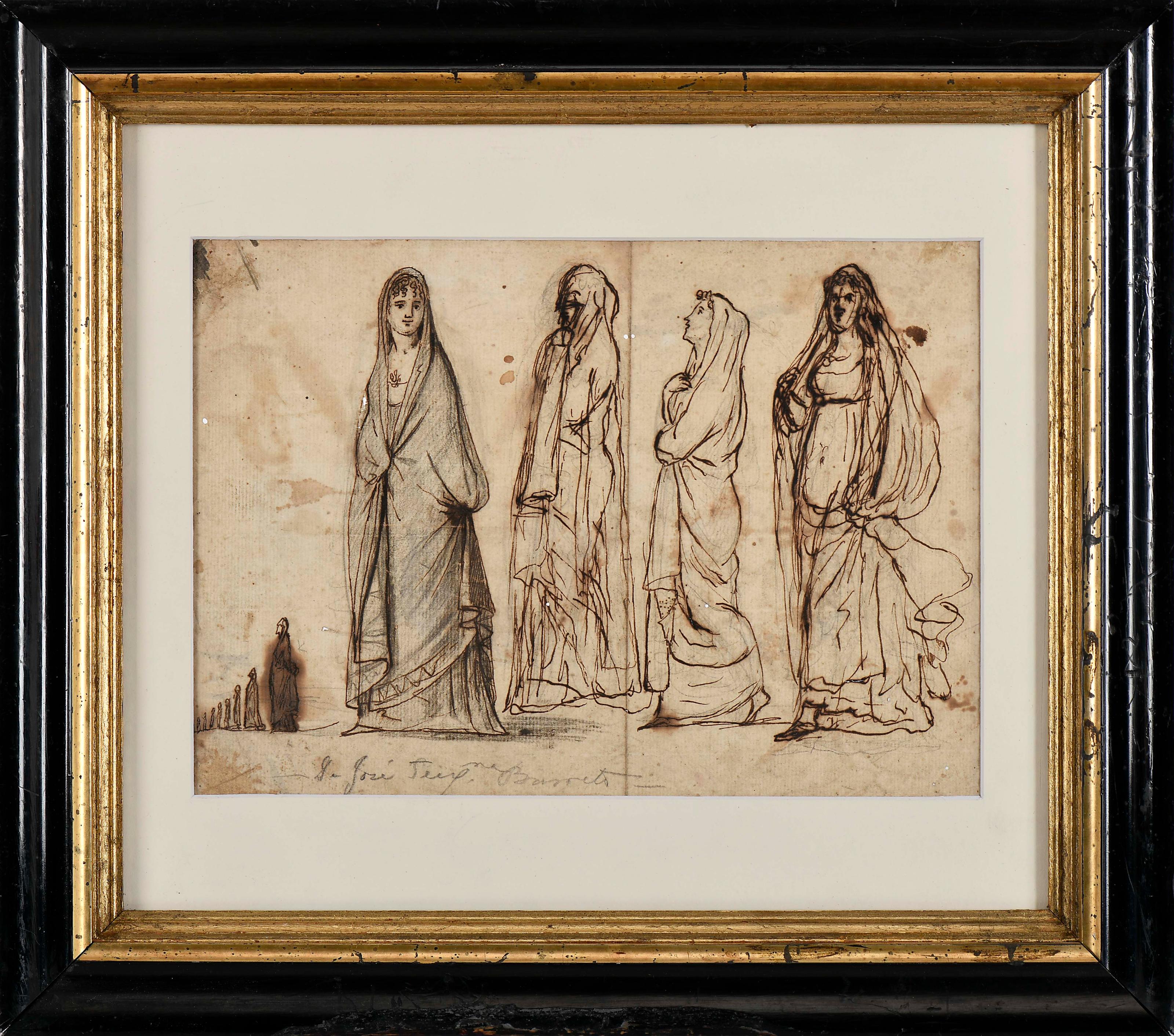 JOSÉ TEIXEIRA BARRETO - 1763-1810 Figuras femininas - estudos dois desenhos à pena e a tinta da China sobre as duas faces de um papel vincos e pequenas manchas no suporte um assinado Dimensões (altura x comprimento x largura) - 21 x 29 cm Notas: José Teixeira Barreto nasceu a 1763 e faleceu a 1810. Conhecido como “o monge pintor”, por aos 19 anos se ter tornado frade beneditino no Mosteiro de São Martinho de Tibães, em Braga, tendo adoptado o nome de Fr. José da Apresentação, estudou desenho em Lisboa residindo, nesse período no Mosteiro de São Bento da Saúde (actual Assembleia da República) tendo mais tarde viajado para Roma para de aperfeiçoamento da sua pintura. Todo este seu percurso estudioso é visível nas suas obras, mais concretamente a sua influência pela Arte Clássica, preferencialmente pelo “gosto romano”. O legado do pintor José Teixeira Barreto é sentido não pela influência que o seu trabalho trouxe para a evolução da pintura portuguesa do século XIX.vd. VASCONCELOS, Flórido - "Os Pintores Teixeira Barreto". Porto: Edições Afrontamento/Câmara Municipal do Porto, 2002, pp. 45-50.