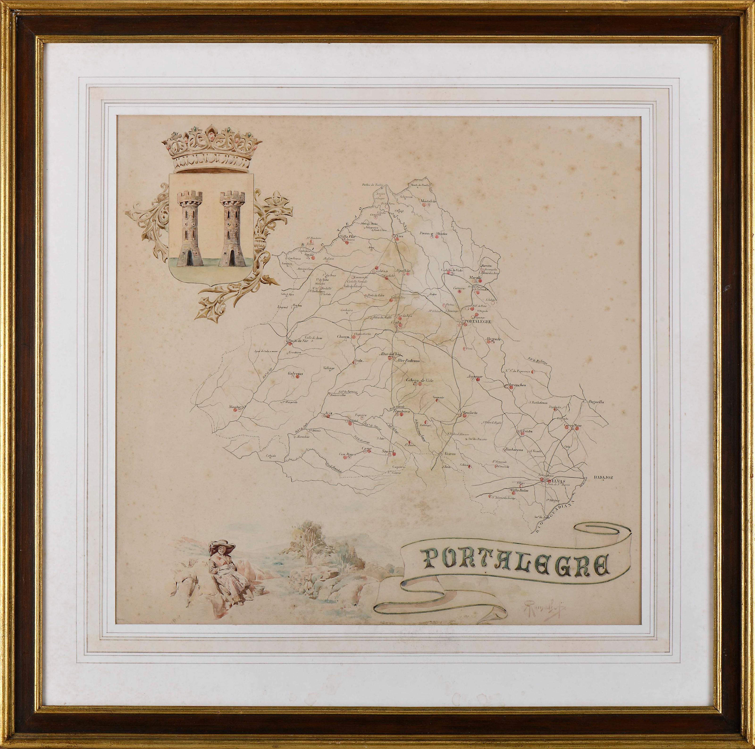 ANTÓNIO RAMALHO - 1858-1916 Mapa do distrito de Portalegre aguarela sobre papel "Alentejana no campo", "Armas da cidade de Portalegre" e inscrição PORTALEGRE manchas de acidez assinada Dimensões (altura x comprimento x largura) - 58,5 x 60,5 cm