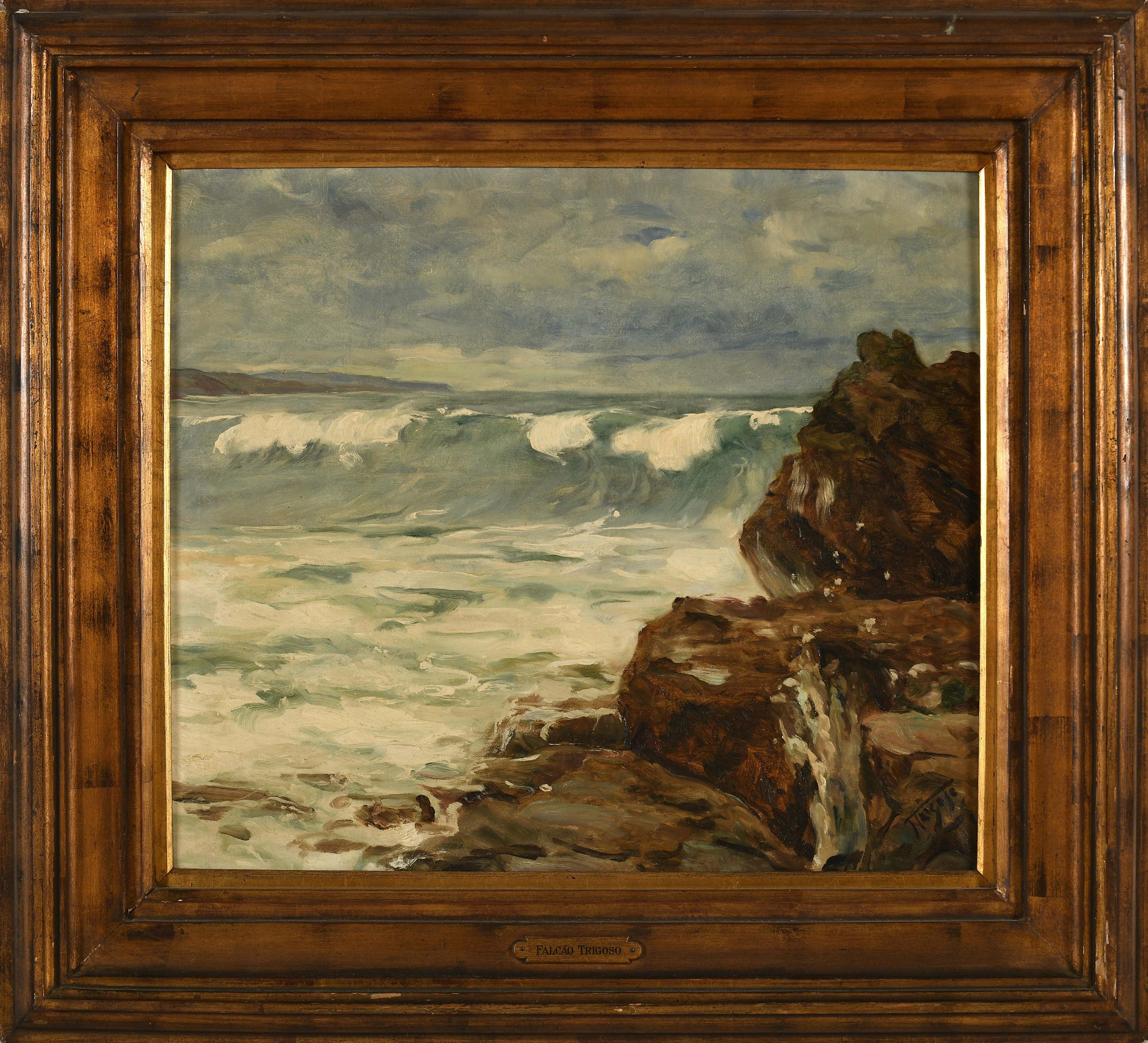 FALCÃO TRIGOSO - 1879-1956 "Ondas - Furnas - Ericeira" óleo sobre tela pequenos restauros assinado Dimensões (altura x comprimento x largura) - 62 x 72 cm Notas: integrou uma exposição na Sociedade Nacional de Belas Artes, conforme etiqueta colada no verso.Obra reproduzida em TRIGOSO, Sylvia Purwin de Figueiredo Falcão - "Falcão Trigoso", Colecção "Pintores Portugueses". Lisboa: Edições Inapa, 2004, p. 103.