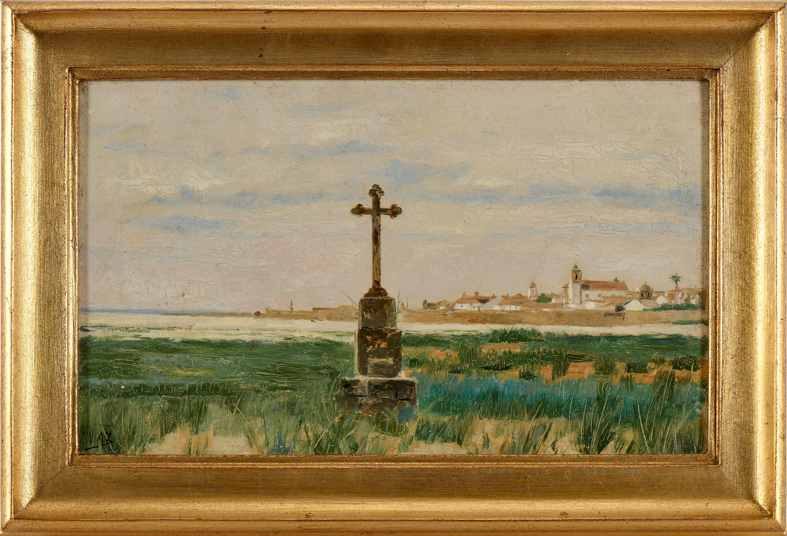 JOÃO VAZ - 1859-1931 "O Cruzeiro" - com Peniche em fundo óleo sobre madeira assinado Dimensões (altura x comprimento x largura) - 14 x 23,5 cm Notas: Proveniência: descendência do artista.Nota: integrou a exposição "João Vaz - 1859-1931 - Um pintor do Naturalismo", realizada na Casa-Museu Dr. Anastácio Gonçalves, encontrando-se reproduzido no respectivo catálogo. Lisboa: Instituto Português de Museus, 2005, p. 223, nº 245.
