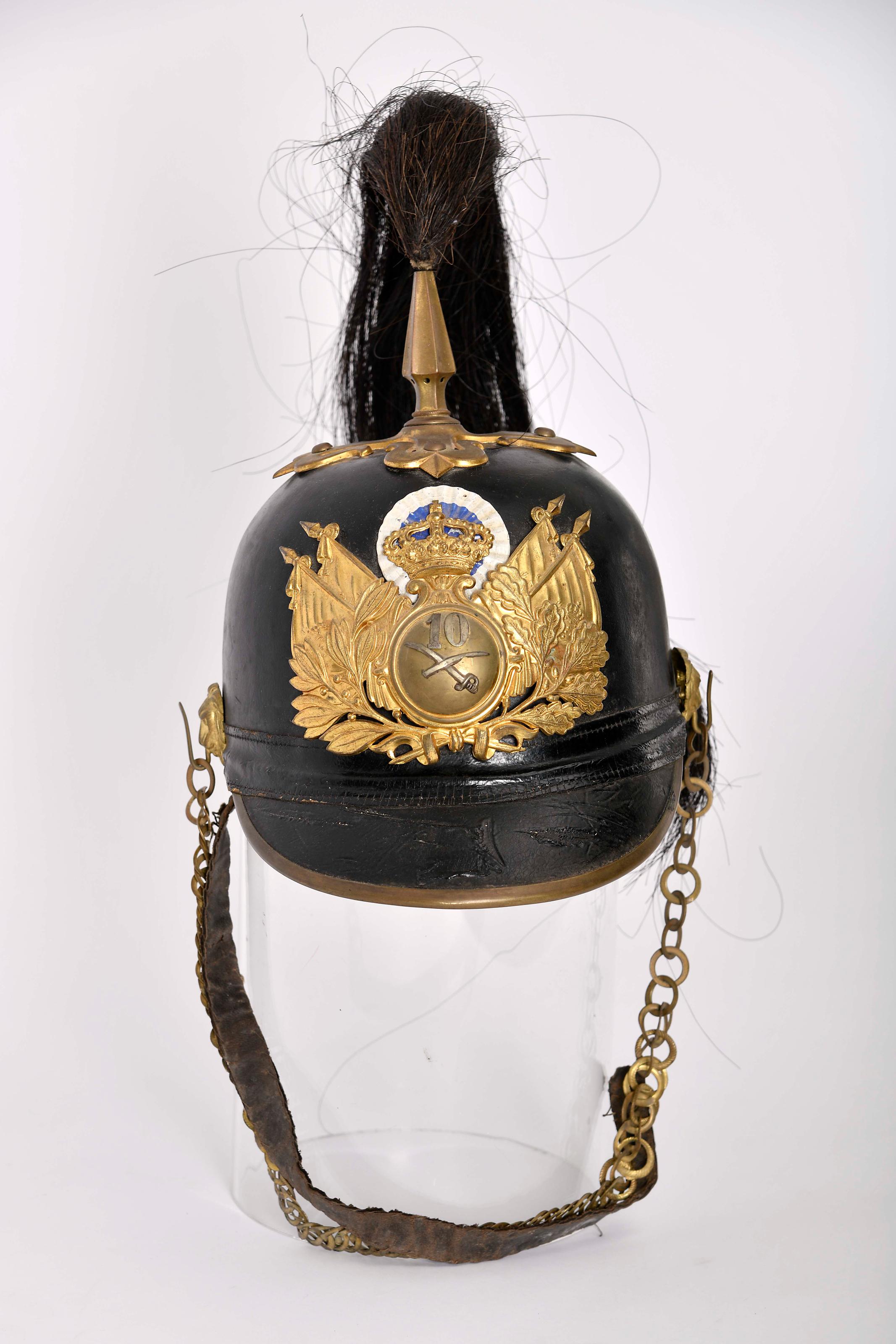 Capacete português para praça de pré do Regimento de Cavalaria nº 10 (1885 a 1892) cartão e pele aplicações em latão relevado, pintado e dourado, penacho em crina Português falta do francalete, falta do suporte metálico do penacho, pequenas faltas e defeitos Dimensões (altura x comprimento x largura) - 24 cm