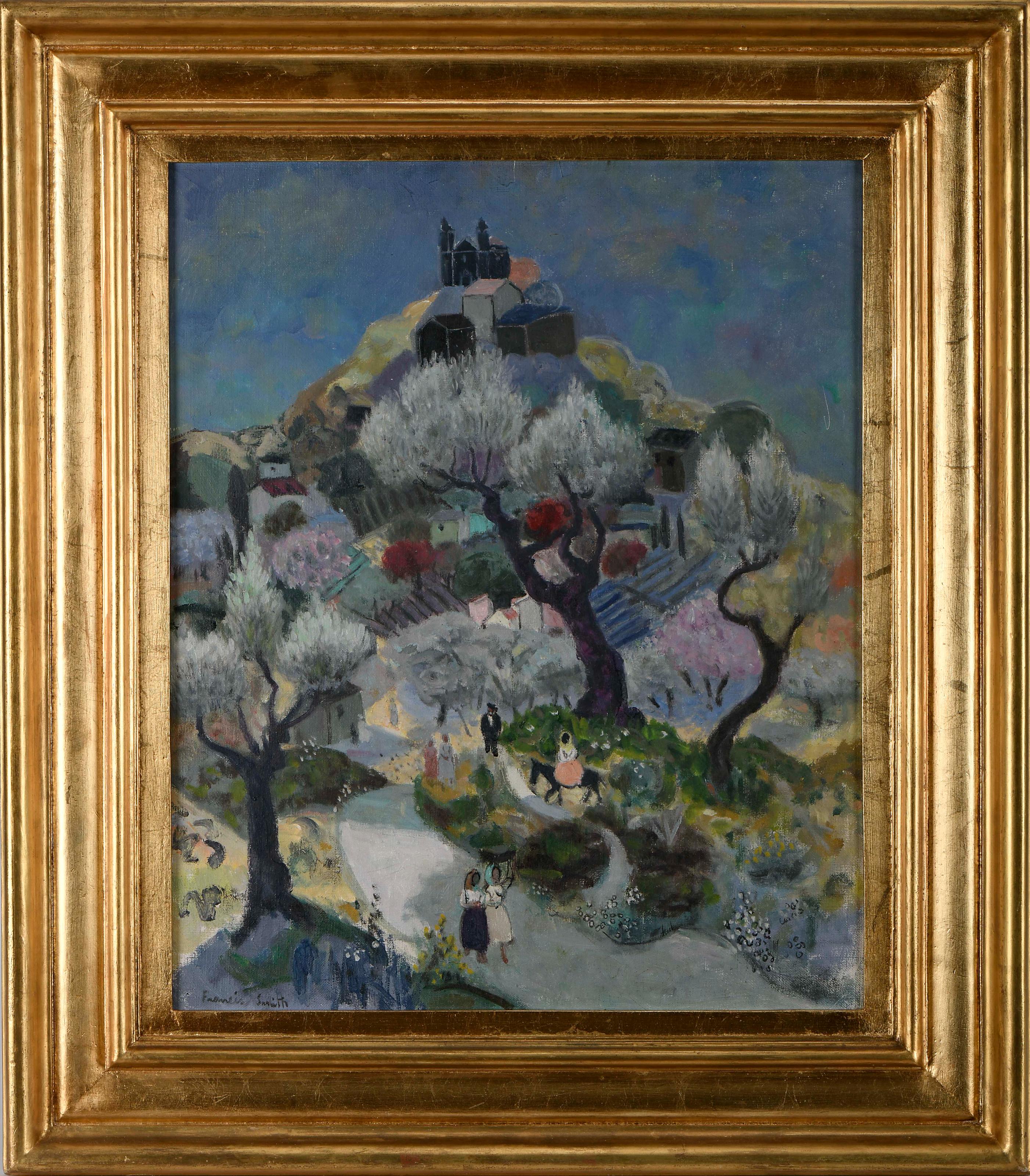 FRANCIS SMITH - 1881-1961 Vista de colina com igreja e figuras óleo sobre tela assinado Dimensões (altura x comprimento x largura) - 64 x 54 cm