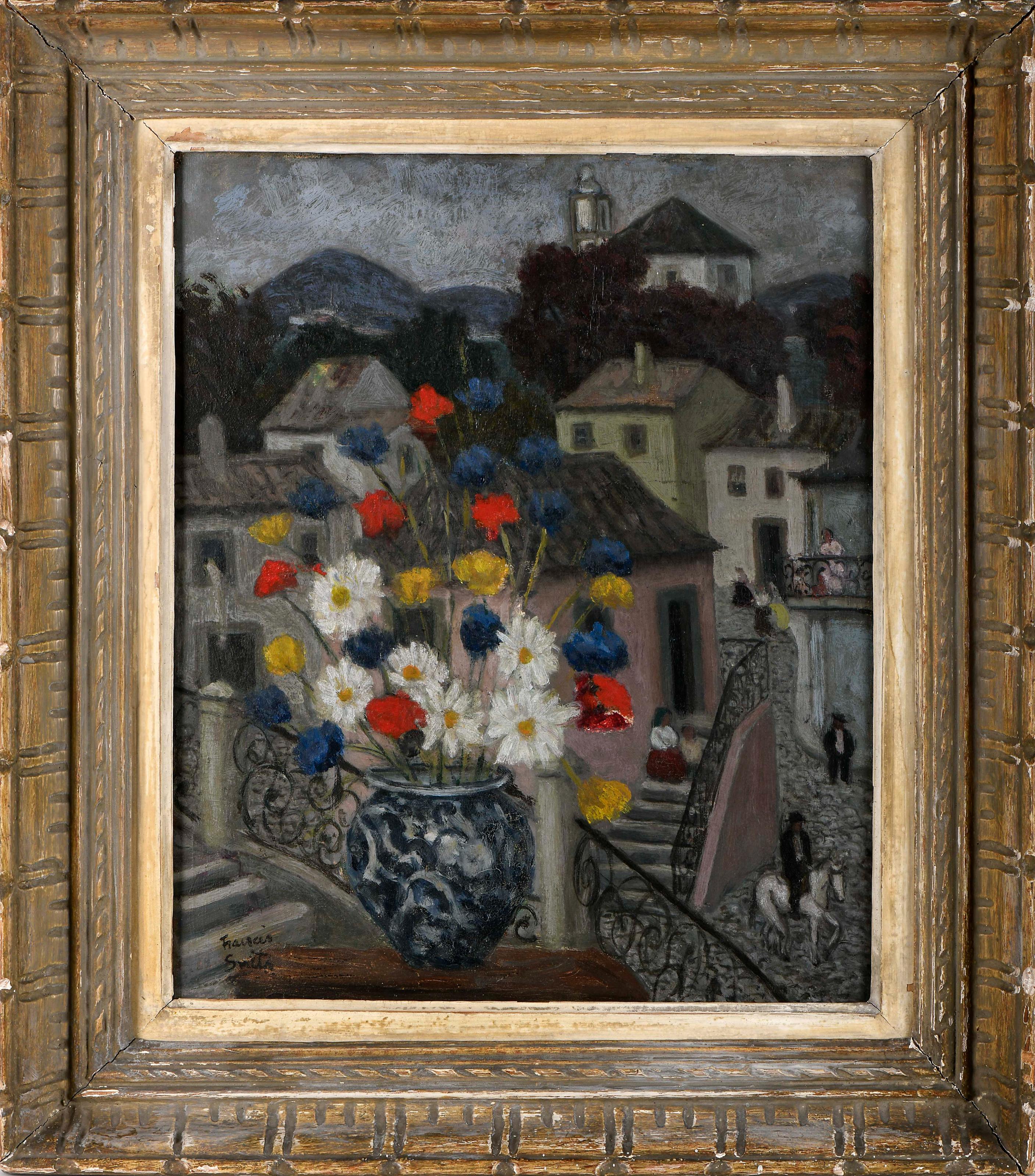 FRANCIS SMITH - 1881-1961 Vista de aldeia com jarra de flores óleo sobre tela pequenos restauros assinado Dimensões (altura x comprimento x largura) - 48 x 36 cm