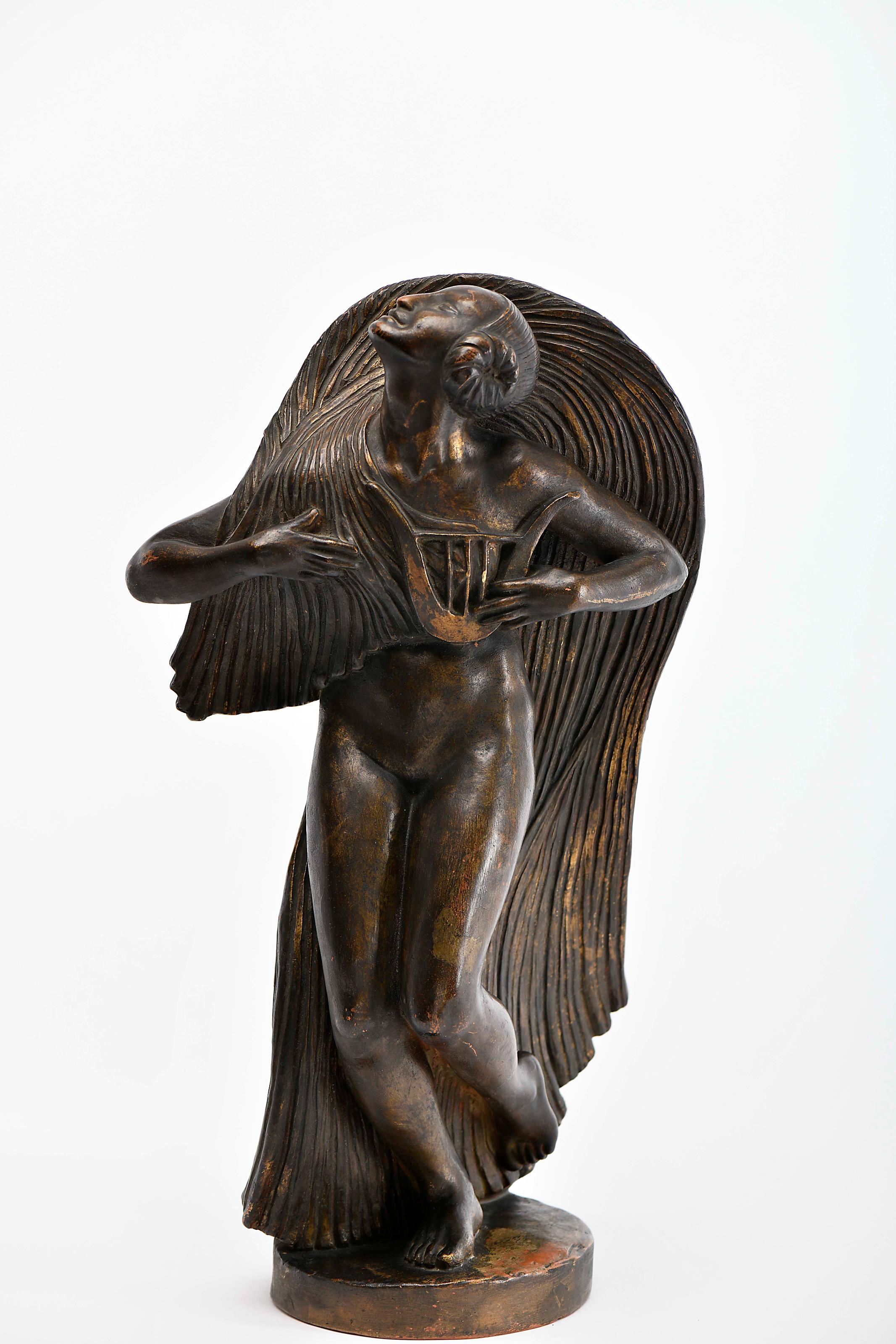 ERNESTO CANTO DA MAYA - 1890-1981 "A Música" escultura em terracota patinada e dourada assinada Dimensões (altura x comprimento x largura) - 47 cm Notas: vd. catálogo da exposição "Canto da Maya - Escultor". Lisboa: Instituto Português do Património Cultural, Fundação Calouste Gulbenkian, 1990, pp. 128 e 129; e catálogo da exposição "Ernesto Canto da Maia - O Escultor Português do Silêncio". Açores: Região Europeia do Ano 2010, Galeria Palácio Galveias, 2010, p. 37.