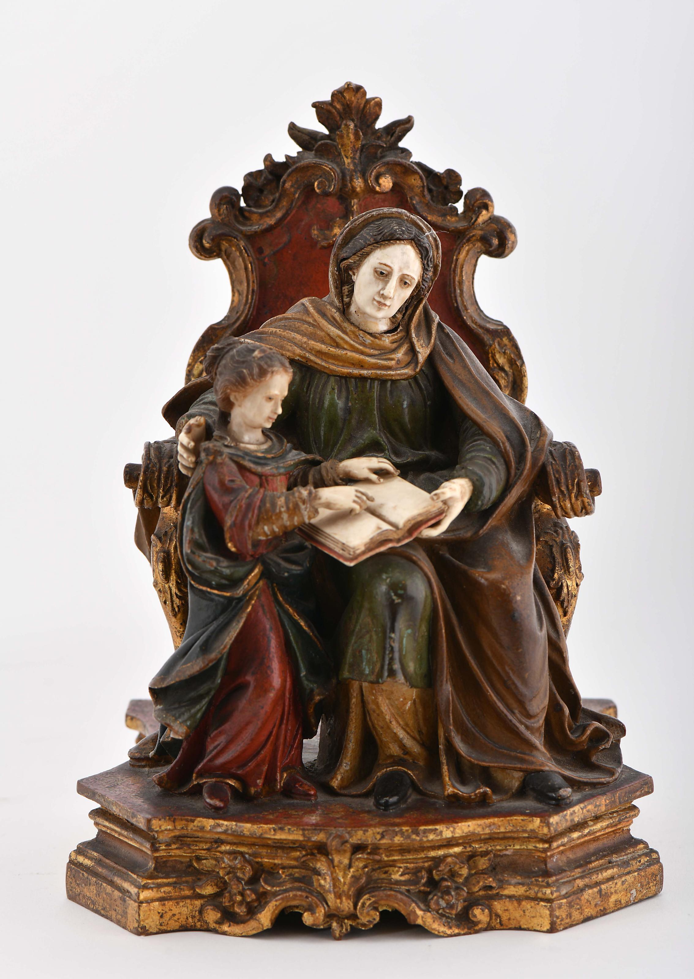 Santana em Majestade ensinando Nossa Senhora a ler escultura em madeira policromada e dourada cara da Santana, cabeça da Nossa Senhora, mãos e livro em marfim Portuguesa séc. XVIII (3º quartel) um dedo partido e colado, pequenas faltas na policromia Dimensões (altura x comprimento x largura) - 22,5 cm Notas: a) Este lote está sujeito às restrições CITES de exportação/importação e encontra-se devidamente certificado: nº 25PTLX05643C;b) É actualmente proibida por diversos países a importação de bens que incorporem materiais de espécies da fauna e flora selvagens protegidas, incluindo, entre outros, marfim, coral e tartaruga;c) Em Portugal, em conformidade com a prevista transposição para a legislação nacional das mais recentes orientações da UE relativas ao comércio de marfim, está suspensa a emissão de certificados de reexportação para países que não integrem a UE;d) Neste contexto, aconselham-se os seus potenciais compradores a informarem-se previamente sobre a legislação do seu país e restrições internacionais aplicáveis.