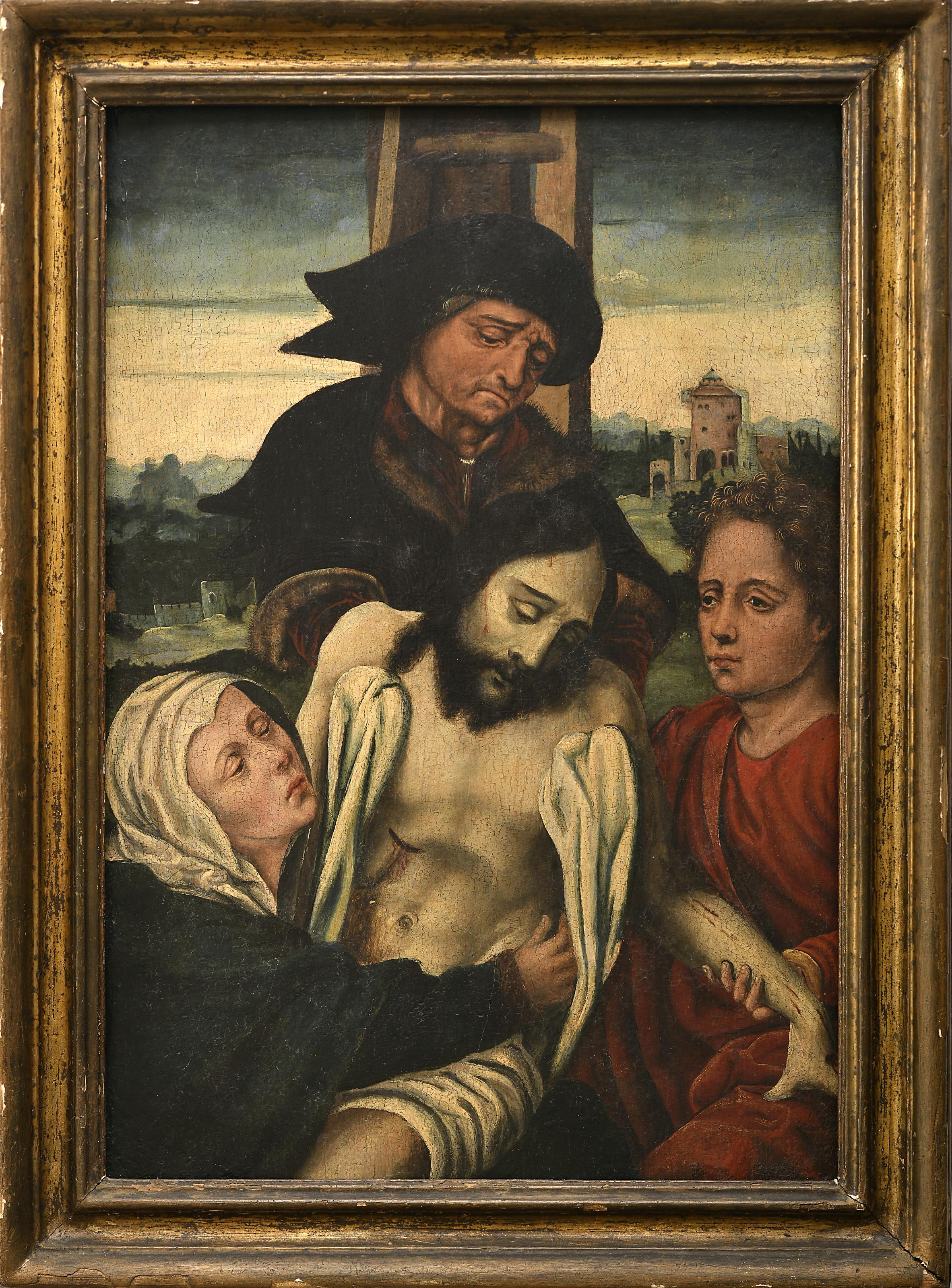Lamentação sobre Cristo morto óleo sobre madeira de carvalho escola Flamenga séc. XV/XVI restauros Dimensões (altura x comprimento x largura) - 37,5 x 26 cm