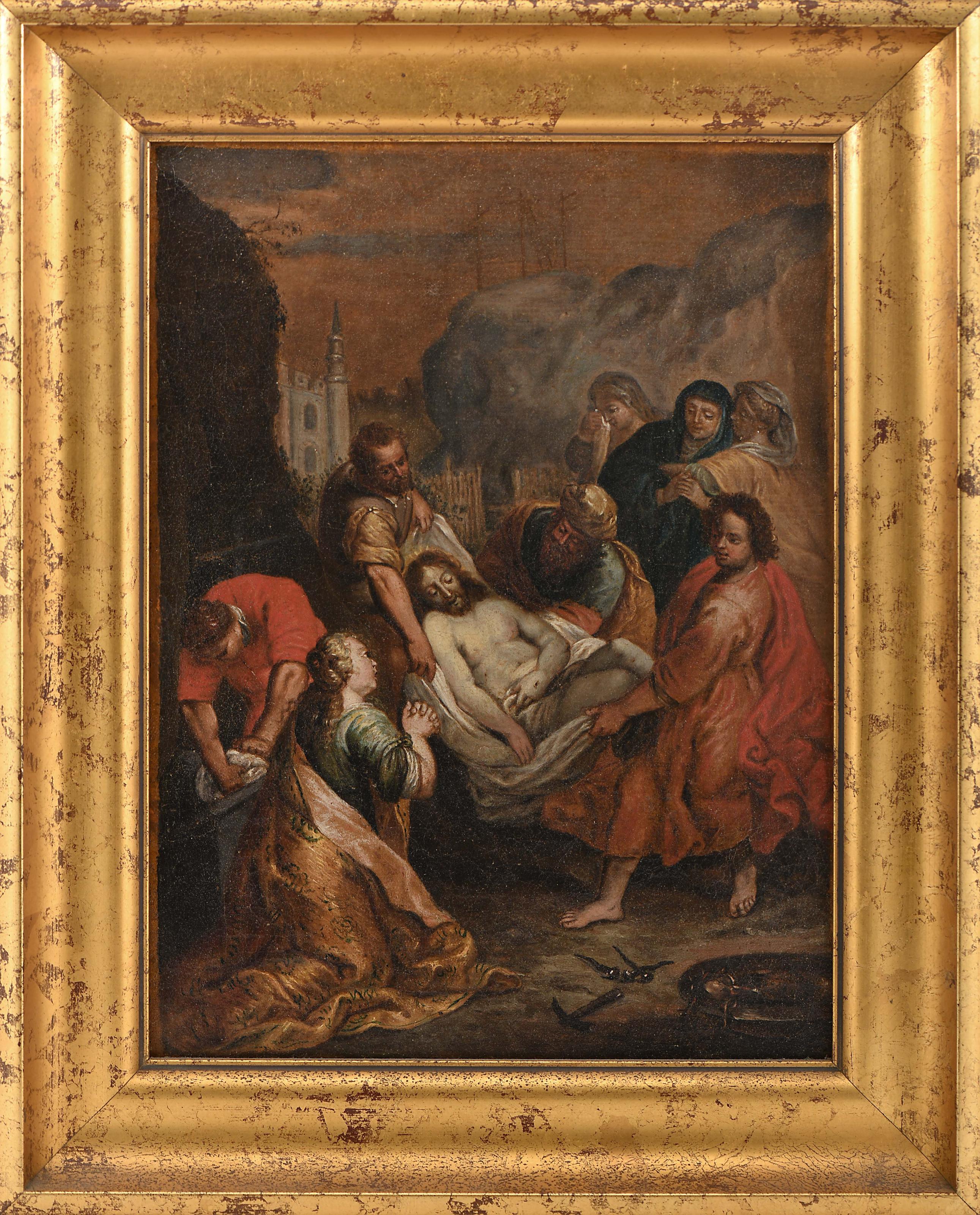 Deposição de Cristo óleo sobre tela segundo pintura original de Federico Barocci (ca.1535-1612) que se encontra no Victoria and Albert Museum, Londres escola Portuguesa séc. XVIII reentelado, restauros verso da tela de reentelagem com inscrição manuscrita 12 DE MAR. DE 1709 - CARLOS MAMEDE BINHETTI Dimensões (altura x comprimento x largura) - 33,5 x 24 cm Notas: vd. https://collections.vam.ac.uk/item/O127911/the-entombment-oil-painting-barocci-federico/ consultado a 13-2-2026 às 15:10.Dois pintores de apelido Binhetti trabalharam em Portugal no século XVIII: Giovanni Pietro Binhetti (1ª metade do séc. XVIII) e João Carlos Binhetti (17??-1816).É provável que o autor da presente pintura esteja familiarmente ligado a um dos dois referidos autores, tendo o primeiro sido estudado por Pedro Dias devido à existência de pinturas de sua autoria na Universidade de Coimbra.vd. DIAS, Pedro - "Pinturas de João Pedro Binhetti na Universidade Coimbra". Coimbra: Separata do Boletim da Universidade de Coimbra, vol. VIII, 1986.