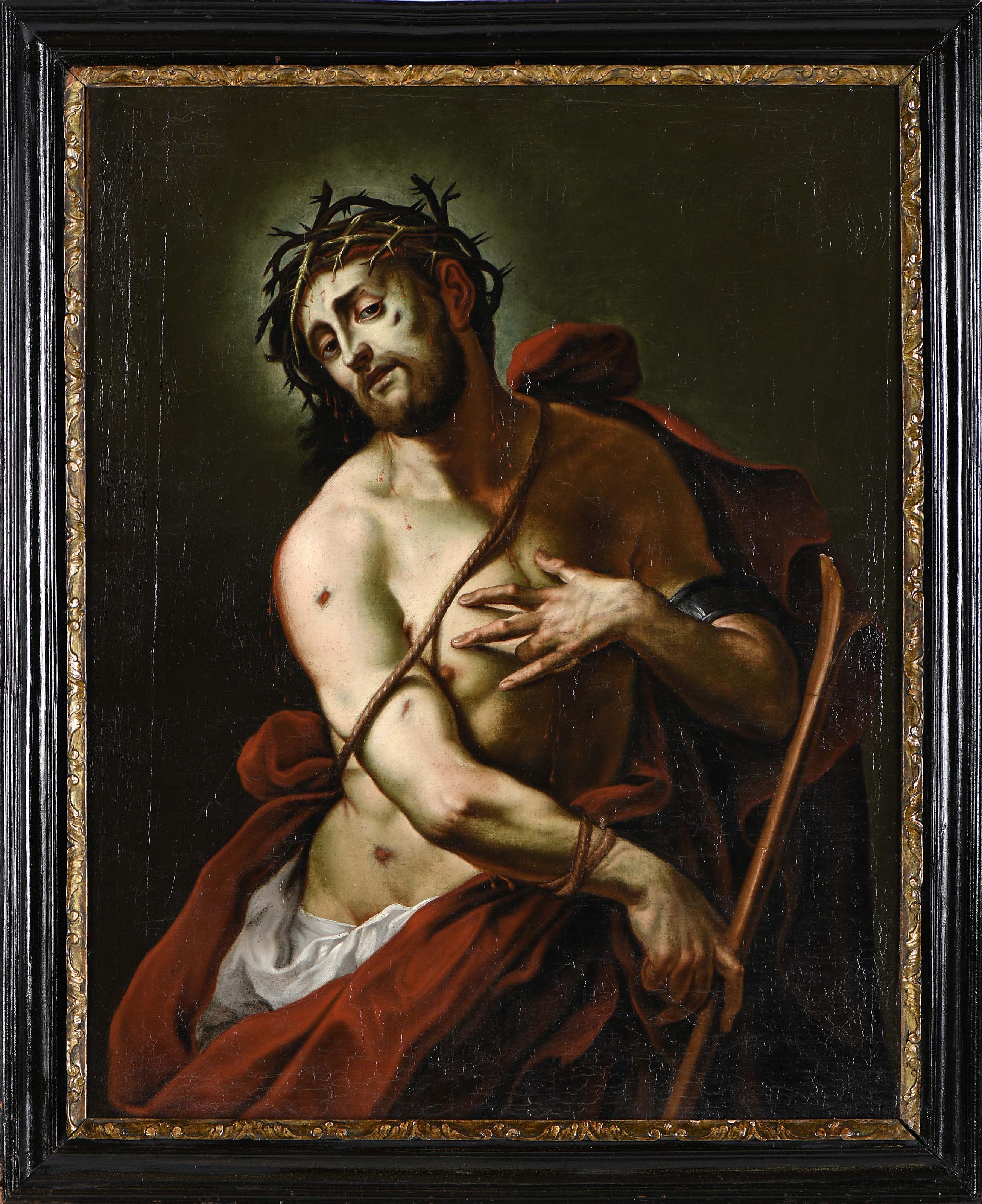 Senhor da Cana Verde óleo sobre tela escola Alemã séc. XVIII (1º quartel) reentelado, pequenos restauros Dimensões (altura x comprimento x largura) - 91 x 70 cm Notas: A presente pintura integrou o leilão de "Pinturas de Antigos Mestres" realizado a 26-6-2025 pela Hampel Fine Art Auctions, Munique, onde se atribui atribuí a autoria a Johann Georg Bergmüller (1688-1762) pelo Dr. Gode Krämer e Dr. Josef Straßer e onde se apresenta a gravura de Gottlieb Heiss (1684-1740) datada de Augsburg de 1716 com representação idêntica. vd. https://www.invaluable.com/auction-lot/johann-georg-bergmueller-1688-tuerkheim-1762-augs-710-c-e734aba94b consultado a 11-02-206 , às 13:04.