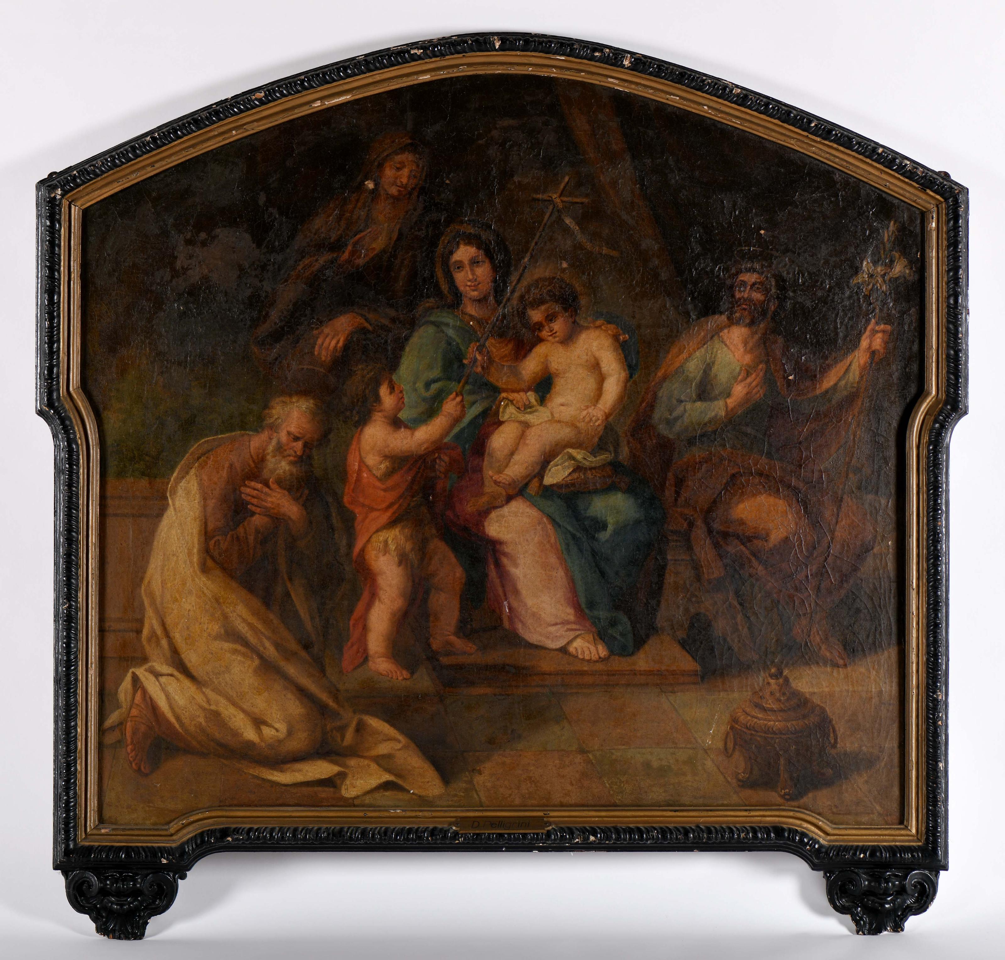 Santa Parentela e São João Baptista óleo sobre tela escola Portuguesa séc. XVIII/XIX extensos restauros antigos, reentelado, restauros antigos, faltas na camada pictórica Dimensões (altura x comprimento x largura) - 101 x 114 cm Notas: moldura com tabela atribuindo a D. PELEGRINI
