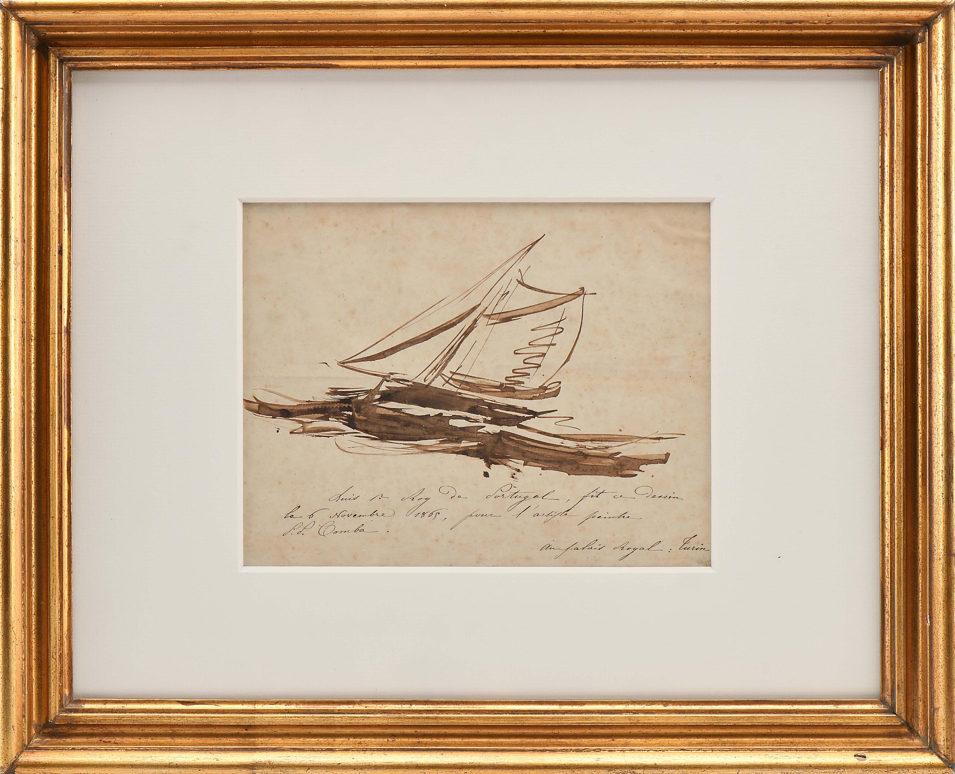 REI D. LUÍS I - 1838-1889 Barco à vela tinta da China sobre papel papel picos de acidez inscrição manuscrita LUIS 1ER ROY DE PORTUGAL, FIT CE DESSIN LE 6 NOVEMBRE 1865, POUR L'ARTISTE PEINTRE P. P. COMBA - AUX PALAIS ROYAL: TURIN Dimensões (altura x comprimento x largura) - 18 x 23 cm Notas: tratar-se-á, provavelmente, do aguarelista Pierre-Paul Comba (1834-1872).Em 1865 o Rei D. Luís e a Rainha Dona Maria Pia deslocaram-se a Turim para apresentar o seu filho - futuro Rei D. Carlos - ao seu avô materno, Vitor Manuel II, Rei de Itália.