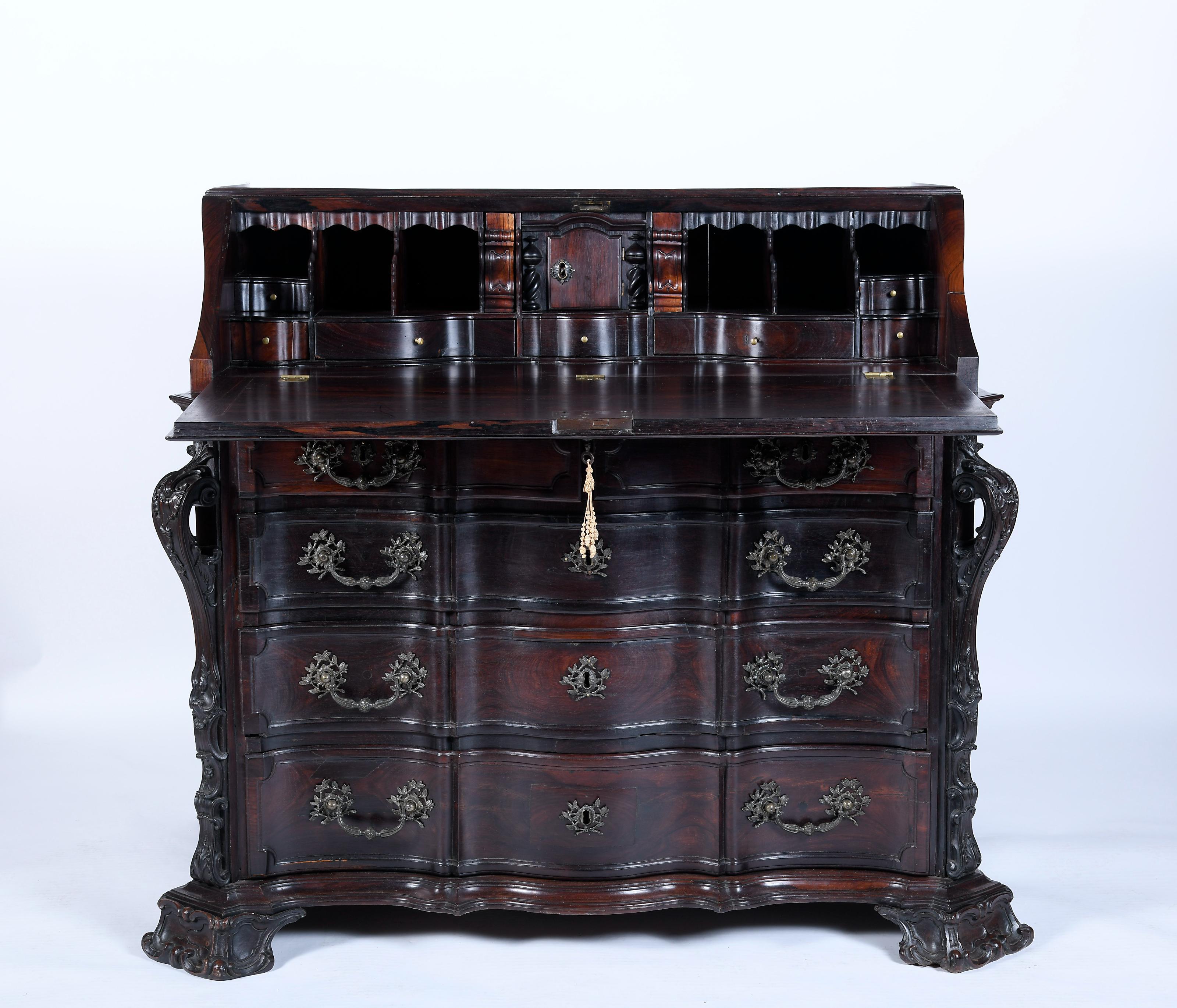 Papeleira «torta e retorta» D. José (1750-1777) pau-santo pilastras e pés entalhados, tampo e frente das gavetas com moldados, interior com porta, segredos, gavetas e escaninhos, puxadores em bronze relevado Portuguesa restauros, pequenas faltas e defeitos Dimensões (altura x comprimento x largura) - 120 x 138 x 89 cm Notas: vd. exemplar semelhante em PINTO, Maria Helena Mendes - "Os Móveis e o seu Tempo - Mobiliário Português do Museu Nacional de Arte Antiga - Séculos XV-XIX". Lisboa: Instituto Português do Património Cultural, 1985-1987, p. 92, nº 82; e FREIRE, Fernanda Castro - "Mobiliário - II volume". Lisboa: Fundação Ricardo do Espirito Santo Silva, Museu-Escola de Artes Decorativas Portuguesas, 2002, pp. 128-129, nº inv. 570.