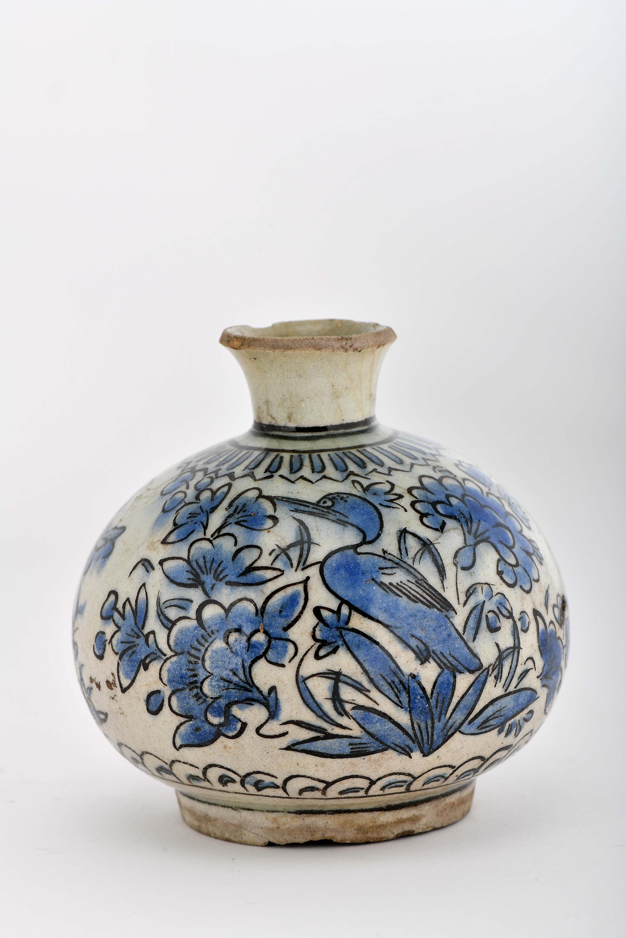Garrafa bojuda faiança Safávida decoração a azul e vinoso "Pássaros e motivos vegetalistas" Iraniana séc. XVII bocal e castigo com esbeiçadelas, faltas no vidrado do bocal Dimensões (altura x comprimento x largura) - 13 cm Notas: a presente garrafa integrou com o nº 532 o leilão da "Fine pottery and Porcelaine" da leiloeira Woolley & Wallis, Salisburia, Inglaterra, realizado a 21 de Fevereiro de 2023 - vd. https://issuu.com/jammdesign/docs/ww_21feb23 consultado a 19-02-2026 às 12:44.