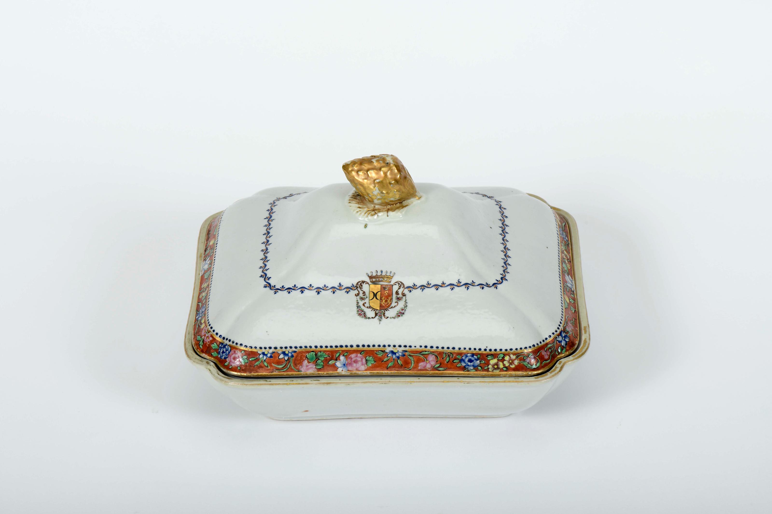 Prato coberto porcelana Chinesa de exportação decoração policromada e dourada com armas de José Maria de Almeida Beltrão de Seabra reinado Jiaqing (1796-1820) restauro na aba da base, desgaste no dourado do bordo e do pomo da tampa Dimensões (altura x comprimento x largura) - 16,5 x 26,5 x 22,8 cm Notas: vd. CASTRO, Nuno de - "A Porcelana Chinesa ao Tempo do Império - Portugal / Brasil". Lisboa: ACD Editores, 2007, p. 215; e DIAS, Pedro - "Heráldica Portuguesa na Porcelana da China Qing". Lisboa: Fundação Macau, 2014, pp. 308-309.