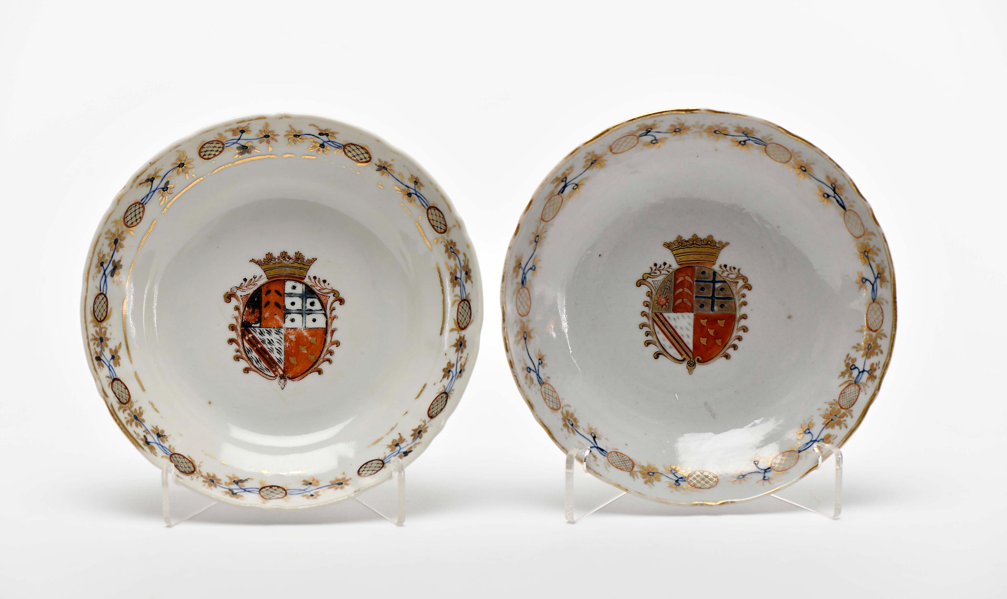 Par de pires recortados porcelana Chinesa de exportação decoração policromada e dourada com armas de Costa (do Cardeal de Alpedrinha), Almeida, Chacim e Abreu reinado Qianlong (1736-1795) desgaste na decoração, um com cabelo Dimensões (altura x comprimento x largura) - 14 cm Notas: vd. CASTRO, Nuno - "A Porcelana Chinesa ao Tempo do Império - Portugal/Brasil". Lisboa: ACD Editores, 2007, p. 221.
