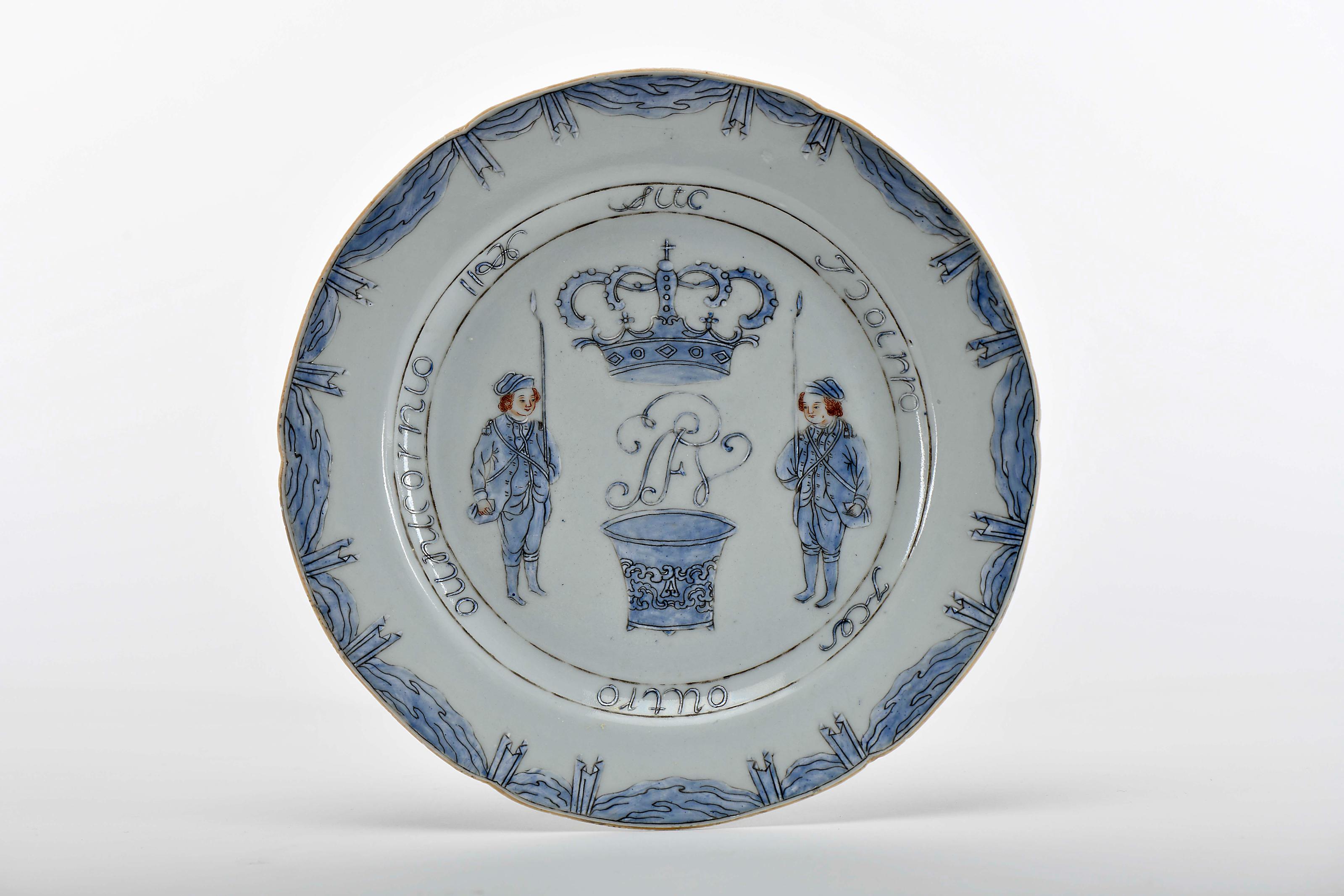 Prato recortado porcelana Chinesa de exportação decoração atribuída ao Colégio Real dos Nobres de Lisboa e tradicionalmente designada "Meninos da Palhavã" a azul com policromia e dourado "Monograma e coroa real" e inscrição SETE BARRO HE OUTRO OUNICORNIO 1776 reinado Qianlong (1736-1795) ligeiro desgaste na decoração Dimensões (altura x comprimento x largura) - 23 cm Notas: vd. CASTRO, Nuno de - "A Porcelana Chinesa ao Tempo do Império - Portugal/Brasil". Lisboa: ACD Editores, 2007, p. 175; e SANTOS, A. Varela - "Portugal na Porcelana da China: 500 Anos de Comércio". Lisboa: Artemágica - vol. III, 2009, pp. 942-947.