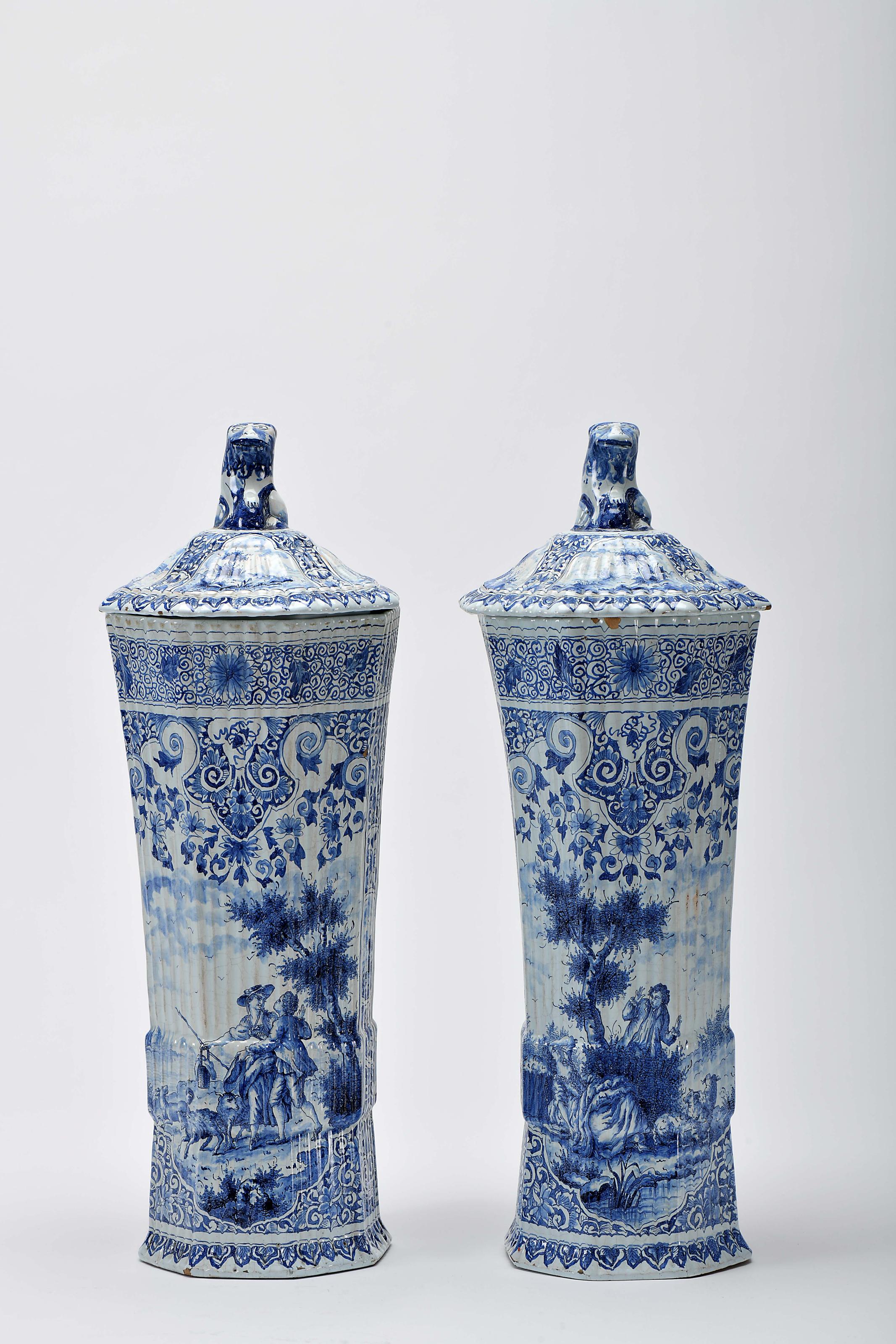 Par de vasos oitavados com tampas faiança de Delft decoração gomada e a azul "Flores", reservas recortadas "Paisagens com figuras", pomos das tampas relevados "Cães sentados" Holandeses séc. XIX pequenas faltas no vidrado marcados FAL ou AL Dimensões (altura x comprimento x largura) - 55,5 cm