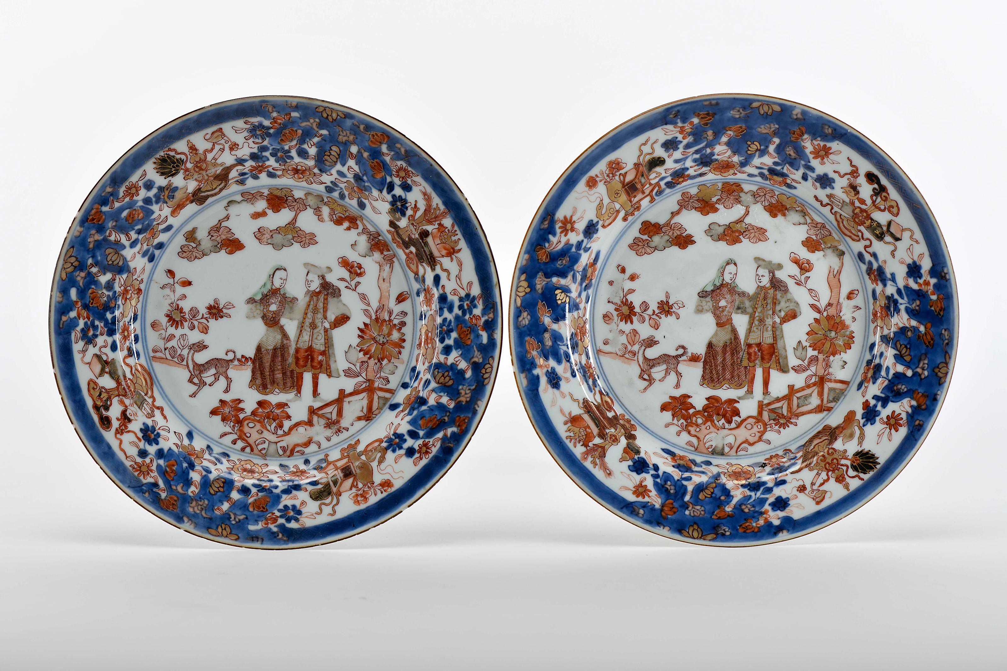 Par de pratos porcelana Chinesa de exportação decoração «Imari» a azul, rouge-de-fer e dourado "Governador Duff e sua mulher" reinado Yongzheng (1722-1735) ligeiras faltas no vidrado do bordo, ligeiro desgaste na decoração Dimensões (altura x comprimento x largura) - 23,5 cm Notas: vd. HERVOUET, François et Nicole; BRUNEAU, Yves - "La Porcelaine des Compagnies des Indes à Décor Occidental". Paris: Flammarion, 1986, pp. 152-153, figs. 7.30 a 7.33; e VEIGA, Jorge Getúlio - "Chinese Export Porcelain in Private Brasilian Collections". London: Han-Shan Tang, 1989, p. 81, nº 56.