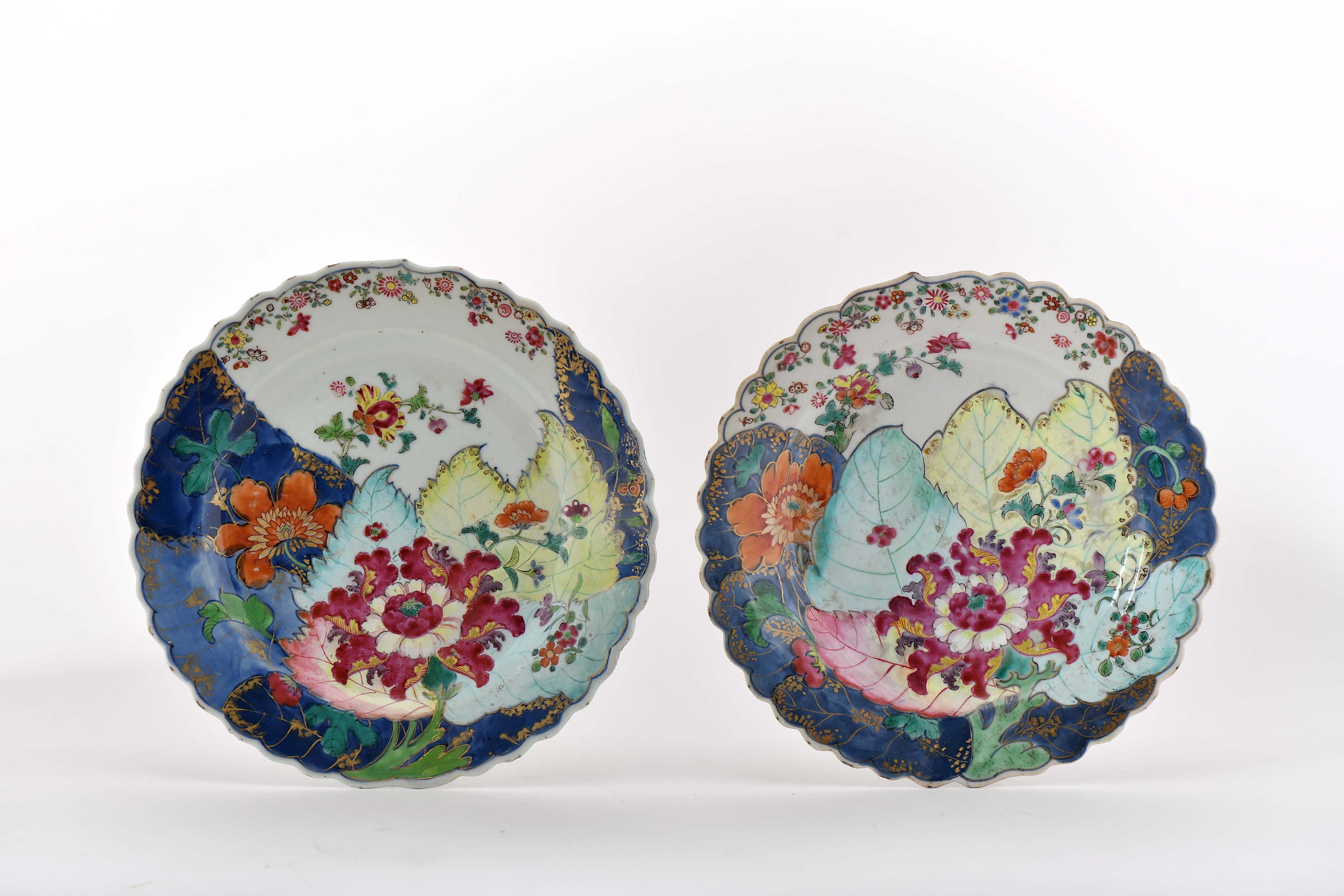 Par de pratos recortados porcelana Chinesa de exportação decoração policromada e dourada «Folha de Tabaco», verso da aba com decoração a azul e rouge-de-fer "Ramos de flores" reinado Qianlong (1736-1795) restaurados, pequenas esbeiçadelas, desgaste na policromia Dimensões (altura x comprimento x largura) - 23 cm Notas: vd. decoração idêntica em DEBOMY, Pierre L. - "Tobacco Leaf and Pseudo/Feuille de Tabac et Pseudo - A Tentative Inventory/Tentative d'Inventaire". Sèvres: Société des Amis du Musée National de Céramique, 2013, pp. 78-81.