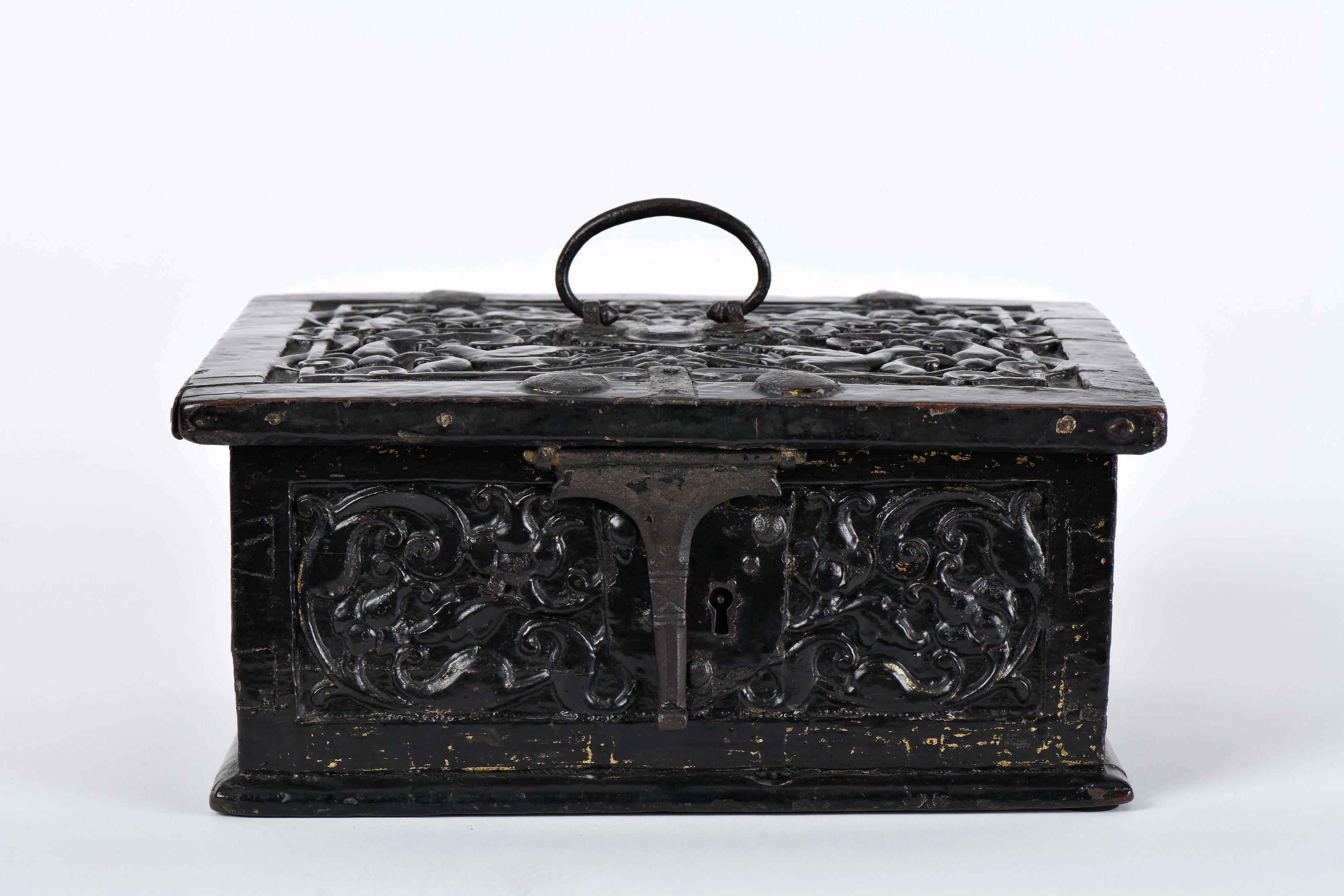 Caixa Lusíada madeira decoração entalhada em talha-baixa “Motivos vegetalistas”, revestimento a laca negra com decoração a ouro, interior com decoração a ouro “Triunfo do Amor”, interior lacado a vermelho, aplicações em ferro, espelho da fechadura recortado “Escudo heráldico” vertente do Sudeste Asiático séc. XVI (2ª metade) pequenos restauros, desgaste no dourado Dimensões (altura x comprimento x largura) - 12 x 26,5 x 21 cm Notas: Colecção privada, Lisboa.Pedro Moura Carvalho afirma que foi “[…] inspirada no «Triunfo do Amor» de Francesco Petrarcha (1304-1374) [esclarecendo que] para além de terem sido publicados inúmeras vezes, os «Triunfos» deste poeta italiano foram também ilustrados frequentemente durante os séculos XV e XVI. A sua notoriedade era de tal forma elevada que um considerável número de majólicas, tapeçarias ou peças de mobiliário foram decoradas com estes temas. Neste caso foi o tema referente ao amor o escolhido, a partir de uma gravura quatrocentista próxima de um original publicado (1488) em Veneza por Bernardino da Novara” – cf. O Mundo da Laca – 2000 Anos de História, p. 143. No catálogo do leilão onde esteve posteriormente integrada é referido que “há, contudo, um aspecto relevante, para que deve ser chamada a atenção: a semelhança das personagens e dos respectivos trajes, presentes na caixa, com as representações habituais, já nessa época, de outras tantas personagens da História de Portugal – D. João III, D. Vasco da Gama, Damião de Góis e Pedro Álvares Cabral – a coroa usada pela personagem real é a coroa usada, à época, pelos reis de Portugal, uma das figuras tem claras semelhanças com o medalhão representando Pedro Álvares Cabral existente no Mosteiro dos Jerónimos. As semelhanças permitem mesmo acreditar que quem executou esta representação, inspirando-se na referida gravura, a terá adaptado para representar as figuras proeminentes da sociedade portuguesa da época” – cf. Cabral Moncada Leilões, catálogo do leilão nº 95, lote nº 94, pp. 100-101.Esta rara e pequena arqueta ou caixa de escrita, feita, ao que tudo indica, em madeira de angelim (Artocarpus spp.), é revestida a laca preta do Sudeste Asiático, ou thitsi, e dourada a folha de ouro nas superfícies exteriores e na face interna da tampa, enquanto o interior é pintado a laca vermelho-cinábrio. Com tampa de levantar, a caixa apresenta um compartimento quadrado maior à direita e um escaninho sob o comprido à esquerda, que teria na origem uma tampa basculante, hoje desaparecida. As ferragens de ferro forjado incluem um espelho de fechadura em escudete, com sua lingueta na frente, uma gualdra na tampa, para facilitar o transporte, e gonzos no tardoz. Todas as superfícies exteriores, excepto o fundo exterior, apresentam decoração em baixo-relevo, avivada a ouro (hoje em grande parte perdida), com ferronneries maneiristas e enrolamentos florais, incluindo grandes peónias e aves, em contraste com cercaduras planas de ornamentação vegetalista a folha de ouro sobre o fundo de laca preta. Esta técnica, conhecida como tiejinqi ou jinqi em chinês, e haku-e em japonês, é característica das lacas birmanesas e tailandesas, designadas, respectivamente, shwei-zawa e lai rod nam.Quando aberta, a caixa revela uma composição extraordinária na face interna da tampa. Executada a folha de ouro sobre o fundo de laca preta e realçada por esgrafitado, de modo a imitar os traços da gravura que lhe serviu de fonte visual, a cena representa o Triunfo do Amor de Petrarca. Um carro, puxado da esquerda para a direita por dois cavalos, transporta, sobre um pedestal escalonado, o Cupido (ou Amor) nu, alado e vendado, apontando o seu arco; logo atrás segue-se uma densa procissão de figuras, entre as quais um rei coroado. Dominando o centro da composição, de um pequeno monte à direita ergue-se, em plena incongruência espacial, um ramo de peónia lenhosa de inspiração chinesa, em plena floração - com flores gigantescas e desproporcionadas - ladeado por aves de cauda longa em voo. Um casal (hoje sumido em parte) surge no canto superior direito, como se observasse a procissão do Amor. Embora as peónias e o diminuto casal em segundo plano constituam adições locais - tendo o casal sido, com probabilidade, concebido para representar os encomendadores da caixa -, a cena inspira-se numa famosa gravura, atribuída a Francesco Rosselli e impressa em Florença na década de 1480, mais de cinquenta anos antes de a caixa ter sido feita no Pegu. Na gravura, o carro de Cupido avança da esquerda para a direita através de uma paisagem ondulada, puxado por quatro cavalos brancos e conduzido por um cocheiro; o Cupido vendado ergue-se sobre um vaso ardente (candelabrum), em equilíbrio sobre um pé e prestes a disparar uma seta; o carro é rodeado por casais de amados (as “vítimas” ou “cativos” do Amor), de trajes variados, incluindo dois reis, e Petrarca aparece em diálogo com um casal, à extrema esquerda.O Triunfo do Amor de Petrarca (Triumphus Cupidinis) constitui o movimento inicial do seu ciclo poético alegórico em língua vulgar italiana, I Trionfi, escrito em terza rima e composto (e revisto por várias vezes) entre 1351 e 1374. Consiste numa visão onírica em que Cupido, numa procissão triunfal de feição romana (um carro e cavalos brancos), desfila um catálogo de ilustres cativos provenientes do mito, da Sagrada Escritura e da história - um espectáculo emblemático do domínio universal do Amor. No plano histórico e cultural, contribuiu para a consolidação da alegoria renascentista ao transpor o triunfo clássico para uma iconografia moral-alegórica duradoura, de larga difusão em manuscritos iluminados, na iconografia dos cassoni, gravuras e tapeçarias. Ao adaptar a gravura ao espaço disponível na face interna da tampa - comprimindo uma composição mais vertical no formato horizontal da t