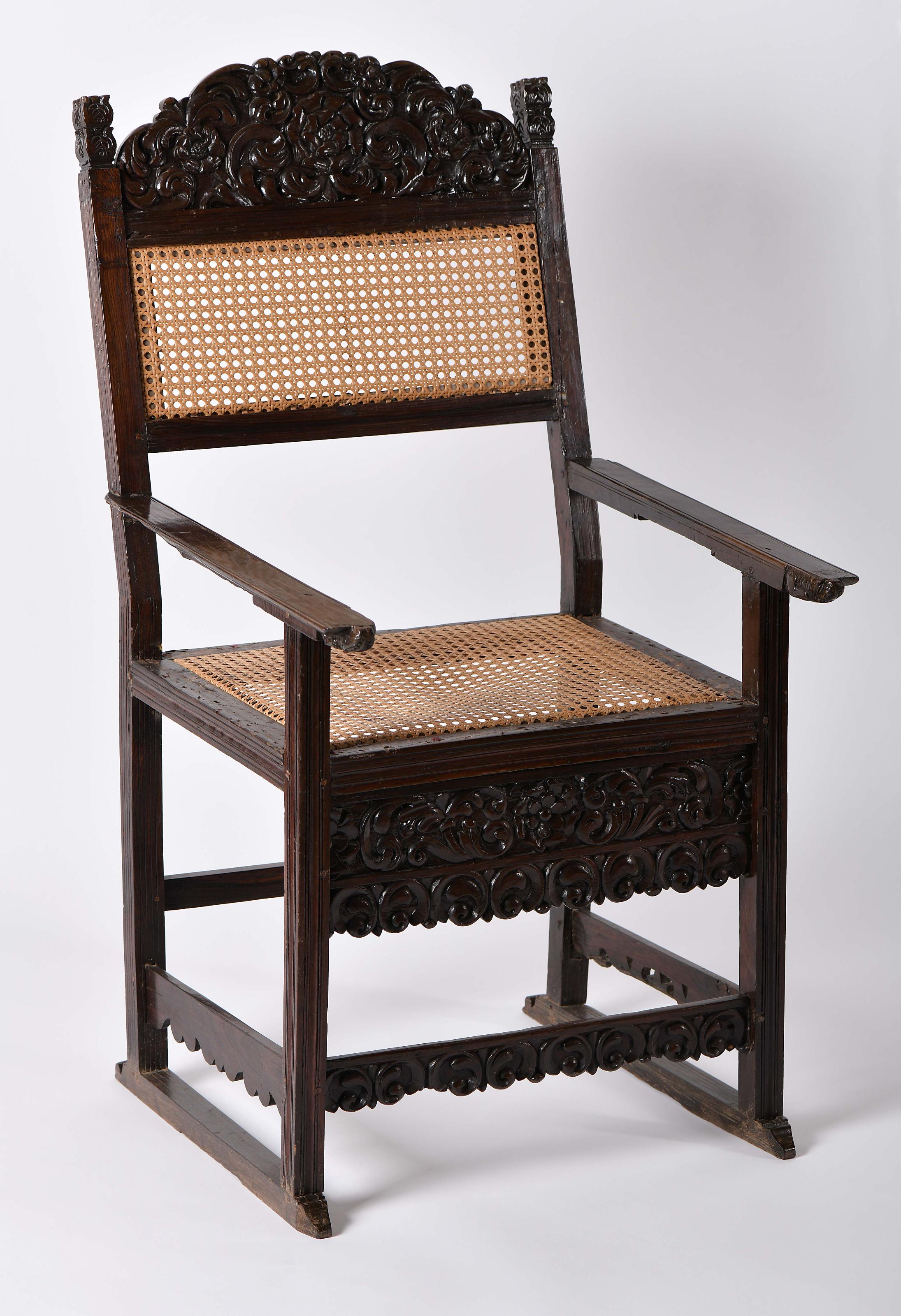 Cadeira de patins Lusíada sissó parte superior do espaldar entalhado "Flores e enrolamentos vegetalistas", extremidades dos braços esculpidas "Cabeça e patas de leão", extremidades das prumadas entalhadas, saial e travejamento recortados e entalhados "Flores e enrolamentos vegetalistas" vertente Indo-Portuguesa séc. XVI/XVII pequenas faltas e defeitos, assento e espaldar com palhinha não original substituindo a corda de fibra de bananeira Dimensões (altura x comprimento x largura) - 108 x 57 x 66 cm Notas: vd. exemplar semelhante em CASTILHO, Manuel - "Na Rota do Oriente", Lisboa, 1999, p. 32, nº 12.