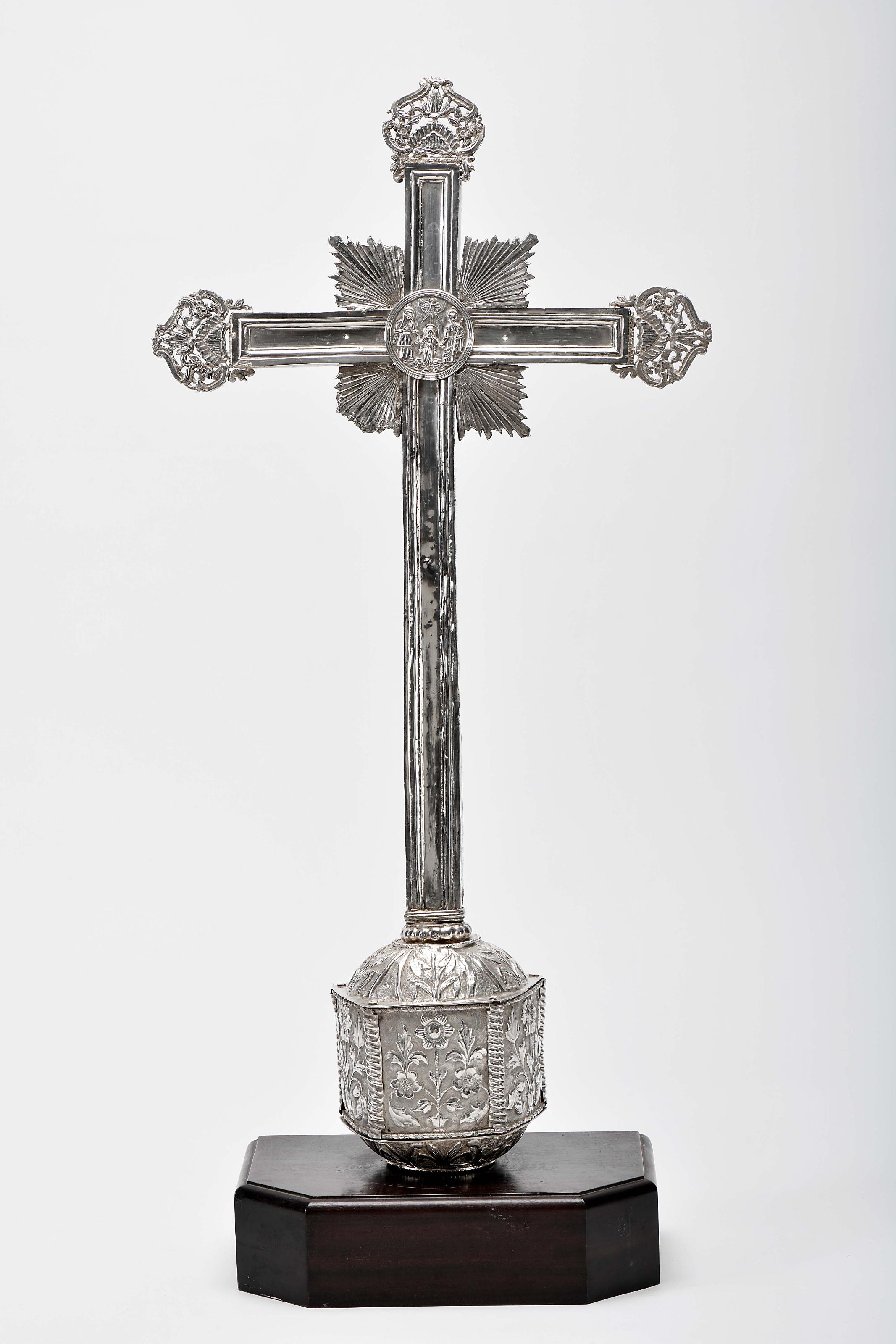 Cruz processional Lusíada prata decoração relevada com dois medalhões "Sagrada Família" e "Nossa Senhora da Conceição", extremidades vazadas, «nó» pentagonal com decoração relevada "Flores" e colunelos espiralados nas arestas, estrutura interior do «nó» em madeira vertente Indo-Portuguesa séc. XVII/XVIII restauros, amolgadelas, pequenas faltas, uma extremidade não original, base não original em madeira sem marcas, ao abrigo do Decreto-Lei nº 120/2017, de 15 de Setembro - art. 2º, nº 2, alínea c) Dimensões (altura x comprimento x largura) - 79 cm Notas: vd. SILVA, Nuno Vassallo e - “A Ourivesaria entre Portugal e a Índia do século XVI ao século XVIII”. Lisboa: Santander Totta, 2008, pp. 61-63.